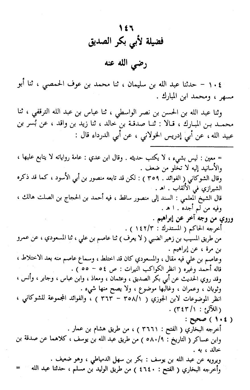104 - حَدَّثَنَا عَبْدُ اللَّهِ بْنُ سُلَيْمَانَ، ثنا مُحَمَّدُ بْنُ عَوْفٍ الْحِمْصِيُّ، ثنا أَبُو مُسْهِرٍ، وَمُحَمَّدُ بْنُ الْمُبَارَكِ، وَثنا عَبْدُ اللَّهِ بْنُ الْحَسَنِ بْنِ نَصْرٍ الْوَاسِطِيُّ، ثنا عَبَّاسُ بْنُ عَبْدِ اللَّهِ التَّرْقُفِيُّ، ثنا مُحَمَّدُ بْنُ الْمُبَارَكِ، قَالَا: ثنا صَدَقَةُ بْنُ خَالِدٍ، ثنا زَيْدُ بْنُ وَاقِدٍ، عَنْ بُسْرِ بْنِ عُبَيْدِ اللَّهِ، عَنْ أَبِي إِدْرِيسَ الْخَوْلَانِيِّ، عَنْ أَبِي الدَّرْدَاءِ، قَالَ -[147]-: كُنْتُ جَالِسًا عِنْدَ رَسُولِ اللَّهِ صَلَّى اللهُ عَلَيْهِ وَسَلَّمَ إِذْ أَقْبَلَ أَبُو بَكْرٍ آخِذًا بِطَرَفِ ثَوْبِهِ، حَتَّى بَدَا عَنْ رُكْبَتِهِ، فَلَمَّا رَآهُ رَسُولُ اللَّهِ صَلَّى اللهُ عَلَيْهِ وَسَلَّمَ قَالَ: «أَمَّا صَاحِبُكُمْ فَقَدْ غَامَرَ» . فَأَقْبَلَ حَتَّى سَلَّمَ عَلَى رَسُولِ اللَّهِ صَلَّى اللهُ عَلَيْهِ وَسَلَّمَ، فَقَالَ: يَا رَسُولَ اللَّهِ، إِنَّهُ كَانَ بَيْنِي وَبَيْنَ عُمَرَ شَيْءٌ، فَأَسْرَعْتُ إِلَيْهِ، ثُمَّ إِنِّي نَدِمْتُ عَلَى مَا كَانَ مِنِّي إِلَيْهِ، سَأَلْتُهُ أَنْ يَغْفِرَ لِي، فَأَبَى عَلَيَّ، فَتَتَبَّعْتُهُ التَّتَبُّعَ كُلَّهُ حَتَّى تَحَزَّرَ بِذَلِكَ مِنِّي، فَأَقْبَلْتُ إِلَيْكِ. فَقَالَ رَسُولُ اللَّهِ صَلَّى اللهُ عَلَيْهِ وَسَلَّمَ: §«يَغْفِرُ اللَّهُ لَكَ يَا أَبَا بَكْرٍ» ثَلَاثَ مَرَّاتٍ. ثُمَّ إِنَّ عُمَرَ نَدِمَ حِينَ سَأَلَهُ أَبُو بَكْرٍ أَنْ يَغْفِرَ لَهُ، فَأَبَى عَلَيْهِ، ثُمَّ خَرَجَ مِنْ مَنْزِلِهِ، حَتَّى أَتَى مَنْزِلَ أَبِي بَكْرٍ، فَسَأَلَ: هَاهُنَا أَبُو بَكْرٍ؟ قَالُوا: لَا. فَعَلِمَ أَنَّهُ عِنْدَ رَسُولِ اللَّهِ صَلَّى اللهُ عَلَيْهِ وَسَلَّمَ. فَأَقْبَلَ عُمَرُ إِلَى رَسُولِ اللَّهِ صَلَّى اللهُ عَلَيْهِ وَسَلَّمَ حَتَّى سَلَّمَ عَلَيْهِ، فَجَعَلَ وَجْهُ رَسُولِ اللَّهِ صَلَّى اللهُ عَلَيْهِ وَسَلَّمَ يَتَغَيَّرُ، حَتَّى أَشْفَقَ أَبُو بَكْرٍ أَنْ يَكُونَ مِنْ رَسُولِ اللَّهِ صَلَّى اللهُ عَلَيْهِ وَسَلَّمَ إِلَى عُمَرَ مَا يَكْرَهُ، فَلَمَّا رَأَى ذَلِكَ أَبُو بَكْرٍ جَثَا عَلَى رُكْبَتَيْهِ، فَقَالَ: يَا رَسُولَ اللَّهِ، أَنَا وَاللَّهِ كُنْتُ أَظْلَمَ. فَقَالَ رَسُولُ اللَّهِ صَلَّى اللهُ عَلَيْهِ وَسَلَّمَ: " يَا أَيُّهَا النَّاسُ، إِنَّ اللَّهَ بَعَثَنِي إِلَيْكُمْ، فَقُلْتُمْ: كَذَبْتَ. وَقَالَ أَبُو بَكْرٍ: صَدَقْتَ. وَوَاسَانِي بِنَفْسِهِ وَمَالِهِ، فَهَلْ أَنْتُمْ تَارِكُو لِي صَاحِبِي؟ فَهَلْ أَنْتُمْ تَارِكُو لِي صَاحِبِي؟ فَهَلْ أَنْتُمْ تَارِكُو لِي صَاحِبِي «؟ ثَلَاثًا» فَمَا أَدْرِي بَعْدَهَا. تَفَرَّدَ أَبُو بَكْرٍ الصِّدِّيقُ بِهَذِهِ الْفَضِيلَةِ، لَمْ يَشْرَكْهُ فِيهَا أَحَدٌ