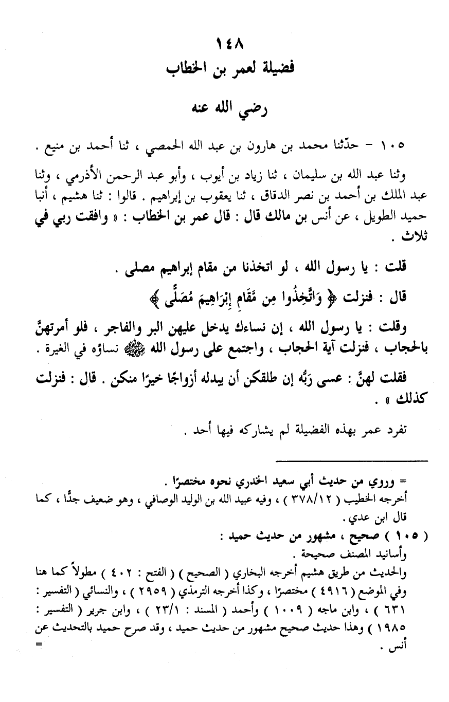 105 - حَدَّثَنَا مُحَمَّدُ بْنُ هَارُونِ بْنِ عَبْدِ اللَّهِ الْحِمْصِيُّ، ثنا أَحْمَدُ بْنُ مَنِيعٍ، وَثنا عَبْدُ اللَّهِ بْنُ سُلَيْمَانَ، ثنا زِيَادُ بْنُ أَيُّوبَ، وَأَبُو عَبْدِ الرَّحْمَنِ الْأَذْرَمِيُّ، وَثنا عَبْدُ الْمَلِكِ بْنُ أَحْمَدَ بْنِ نَصْرٍ الدَّقَّاقُ، ثنا يَعْقُوبُ بْنُ إِبْرَاهِيمَ، قَالُوا: ثنا هُشَيْمٌ، أنبا حُمَيْدٌ الطَّوِيلُ، عَنْ أَنَسِ بْنِ مَالِكٍ، قَالَ: قَالَ عُمَرُ بْنُ الْخَطَّابِ،: " §وَافَقْتُ رَبِّي فِي ثَلَاثٍ، قُلْتُ: يَا رَسُولَ اللَّهِ، لَوِ اتَّخَذْنَا مِنْ مَقَامِ إِبْرَاهِيمَ مُصَلًّى. قَالَ: فَنَزَلَتْ {وَاتَّخِذُوا مِنْ مَقَامِ إِبْرَاهِيمَ مُصَلًّى} [البقرة: 125] وَقُلْتُ: يَا رَسُولَ اللَّهِ، إِنَّ نِسَاءَكَ يَدْخُلُ عَلَيْهِنَّ الْبَرُّ وَالْفَاجِرُ، فَلَوْ أَمَرْتَهُنَّ بِالْحِجَابِ، فَنَزَلَتْ آيَةُ الْحِجَابِ، وَاجْتَمَعَ عَلَى رَسُولِ اللَّهِ صَلَّى اللهُ عَلَيْهِ وَسَلَّمَ نِسَاؤُهُ فِي الْغَيْرَةِ، فَقُلْتُ لَهُنَّ: عَسَى رَبُّهُ إِنْ طَلَّقَكُنَّ أَنْ يُبْدِلَهُ أَزْوَاجًا خَيْرًا مِنْكُنَّ. قَالَ: فَنَزَلَتْ كَذَلِكَ " تَفَرَّدَ عُمَرُ بِهَذِهِ الْفَضِيلَةِ، لَمْ يُشَارِكْهُ فِيهَا أَحَدٌ
