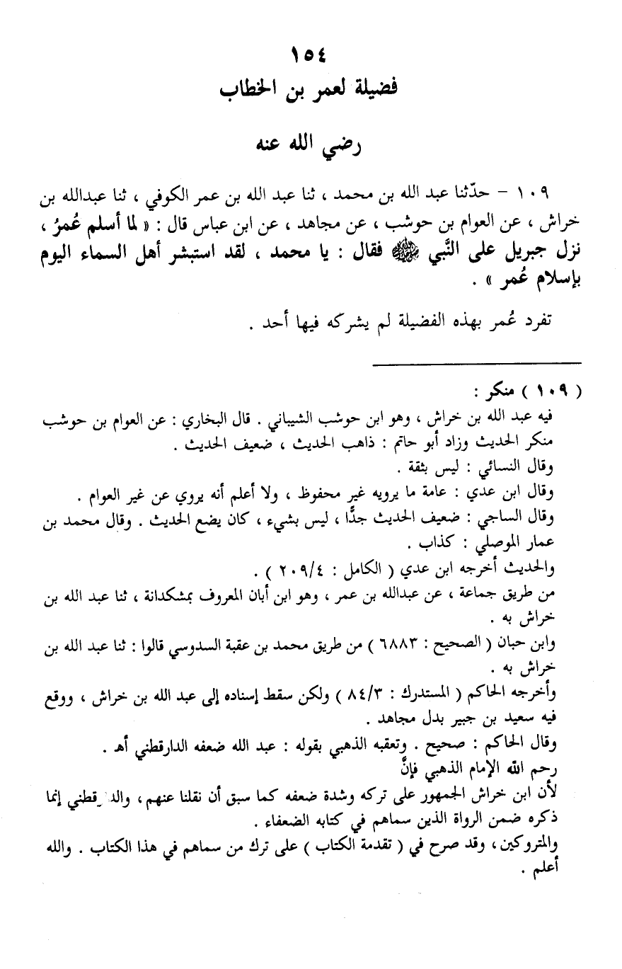 109 - حَدَّثَنَا عَبْدُ اللَّهِ بْنُ مُحَمَّدٍ، ثنا عَبْدُ اللَّهِ بْنُ عُمَرَ الْكُوفِيُّ، ثنا عَبْدُ اللَّهِ بْنُ خِرَاشٍ، عَنِ الْعَوَّامِ بْنِ حَوْشَبٍ، عَنْ مُجَاهِدٍ، عَنِ ابْنِ عَبَّاسٍ، قَالَ: لَمَّا أَسْلَمَ عُمَرُ، نَزَلَ جِبْرِيلُ عَلَى النَّبِيِّ صَلَّى اللهُ عَلَيْهِ وَسَلَّمَ، فَقَالَ: «يَا مُحَمَّدُ، لَقَدِ §اسْتَبْشَرَ أَهْلُ السَّمَاءِ الْيَوْمَ بِإِسْلَامِ عُمَرَ» تَفَرَّدَ عُمَرُ بِهَذِهِ الْفَضِيلَةِ، لَمْ يَشْرَكْهُ فِيهَا أَحَدٌ