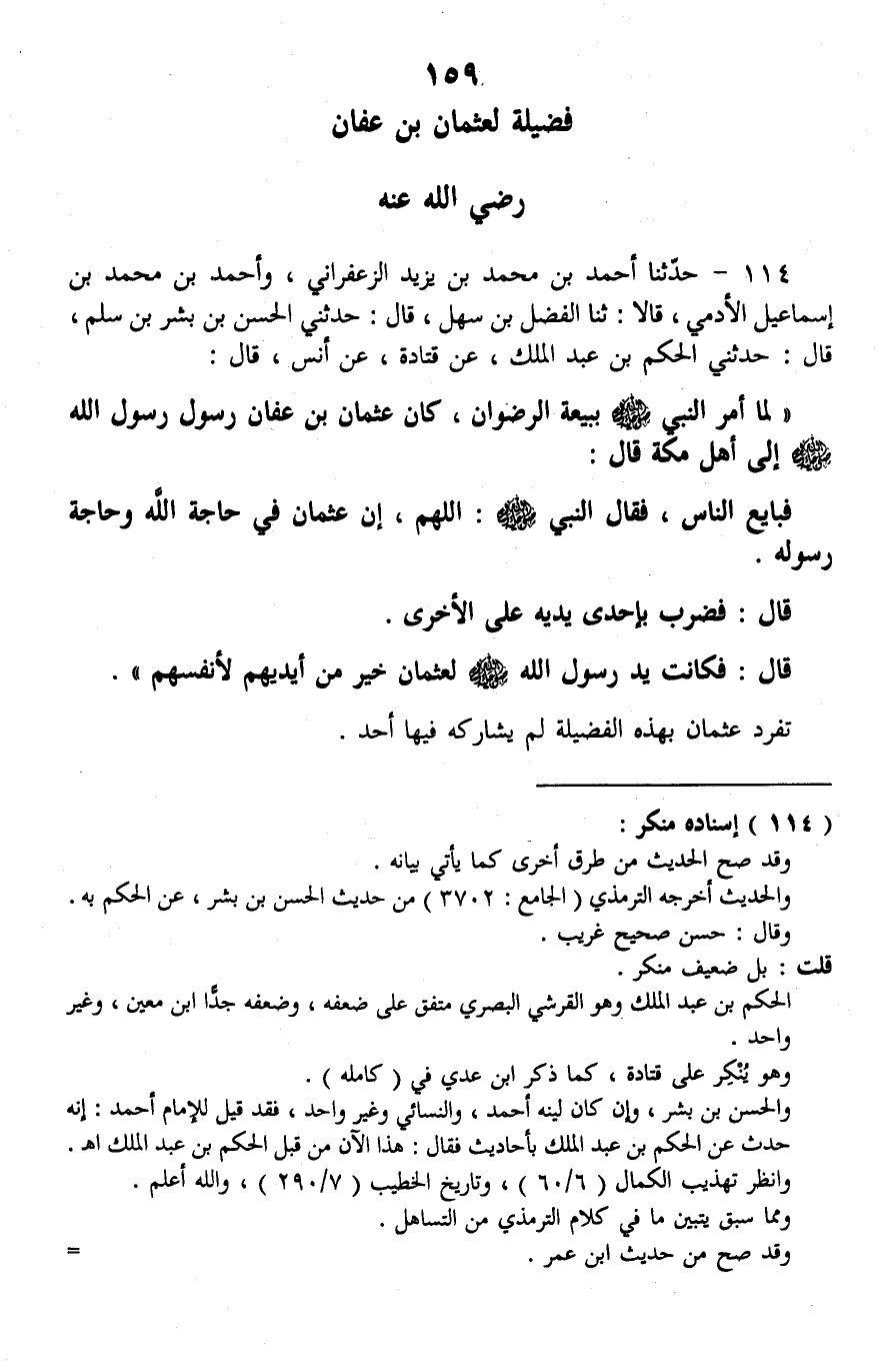 114 - حَدَّثَنَا أَحْمَدُ بْنُ مُحَمَّدِ بْنِ يَزِيدَ الزَّعْفَرَانِيُّ، وَأَحْمَدُ بْنُ مُحَمَّدِ بْنِ إِسْمَاعِيلَ الْأَدَمِيُّ، قَالَا: ثنا الْفَضْلُ بْنُ سَهْلٍ، قَالَ: حَدَّثَنِي الْحَسَنُ بْنُ بِشْرِ بْنِ سَلْمٍ، قَالَ: حَدَّثَنِي الْحَكَمُ بْنُ عَبْدِ الْمَلِكِ، عَنْ قَتَادَةَ، عَنْ أَنَسٍ، قَالَ: لَمَّا أَمَرَ النَّبِيُّ صَلَّى اللهُ عَلَيْهِ وَسَلَّمَ بِبَيْعَةِ الرِّضْوَانِ، كَانَ عُثْمَانُ بْنُ عَفَّانَ رَسُولَ رَسُولِ اللَّهِ صَلَّى اللهُ عَلَيْهِ وَسَلَّمَ إِلَى أَهْلِ مَكَّةَ. قَالَ: فَبَايَعَ النَّاسُ، فَقَالَ النَّبِيُّ صَلَّى اللهُ عَلَيْهِ وَسَلَّمَ: §«اللَّهُمَّ إِنَّ عُثْمَانَ فِي حَاجَةِ اللَّهِ وَحَاجَةِ رَسُولِهِ» . قَالَ: فَضَرَبَ بِإِحْدَى يَدَيْهِ عَلَى الْأُخْرَى. قَالَ: فَكَانَتْ يَدُ رَسُولِ اللَّهِ صَلَّى اللهُ عَلَيْهِ وَسَلَّمَ لِعُثْمَانَ خَيْرًا مِنْ أَيْدِيهِمْ لِأَنْفُسِهِمْ. تَفَرَّدَ عُثْمَانُ بِهَذِهِ الْفَضِيلَةِ، لَمْ يَشْرَكْهُ فِيهَا أَحَدٌ