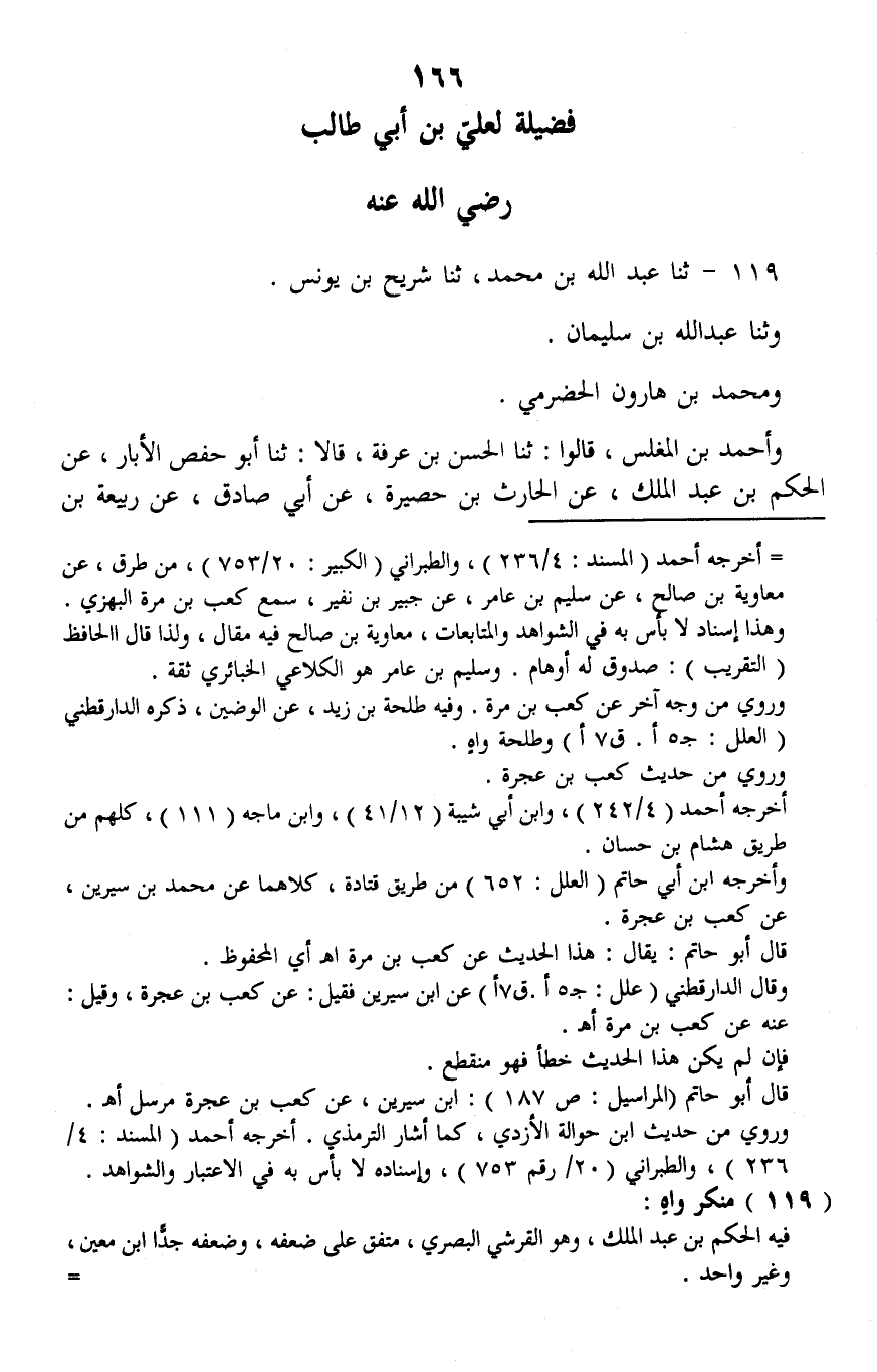 119 - ثنا عَبْدُ اللَّهِ بْنُ مُحَمَّدٍ، ثنا شُرَيْحُ بْنُ يُونُسَ، وَثنا عَبْدُ اللَّهِ بْنِ سُلَيْمَانَ، وَمُحَمَّدُ بْنُ هَارُونَ الْحَضْرَمِيُّ، وَأَحْمَدُ بْنُ الْمُغَلِّسِ، قَالُوا: ثَنَا الْحَسَنُ بْنُ عَرَفَةَ، قَالَا: ثنا أَبُو حَفْصٍ الْأَبَّارُ، عَنِ الْحَكَمِ بْنِ عَبْدِ الْمَلِكِ، عَنِ الْحَارِثِ بْنِ حَصِيرَةَ، عَنْ أَبِي صَادِقٍ، عَنْ رَبِيعَةَ بْنِ -[167]- نَاجِذٍ، عَنْ عَلِيِّ بْنِ أَبِي طَالِبٍ، قَالَ: قَالَ لِي النَّبِيُّ صَلَّى اللهُ عَلَيْهِ وَسَلَّمَ قَالَ: «يَا عَلِيُّ، §فِيكَ مَثَلٌ مِنْ عِيسَى، أَبْغَضَتْهُ الْيَهُودُ حَتَّى بَهَتُوا أُمَّهُ، وَأَحَبَّتْهُ النَّصَارَى حَتَّى أَنْزَلُوهُ بِالْمَنْزِلَةِ الَّتِي لَيْسَ بِهِ» فَقَالَ عَلِيٌّ: " يَهْلِكُ فِيَّ رَجُلَانِ: مُحِبٌّ مُفْرِطٌ، يُفْرِطُنِي بِمَا لَيْسَ فِيَّ، وَمُبْغِضٌ، يَحْمِلُهُ شَنَآنِي عَلَى أَنْ يَبْهَتَنِي " لَفْظُ شُرَيْحٍ. تَفَرَّدَ بِهَذِهِ الْفَضِيلَةِ عَلِيُّ بْنُ أَبِي طَالِبٍ، لَمْ يَشْرَكْهُ فِيهَا أَحَدٌ