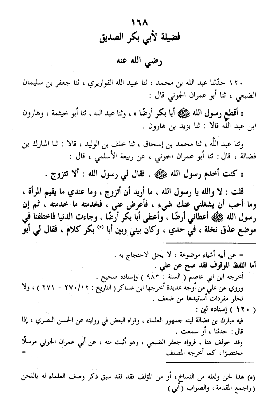 120 - حَدَّثَنَا عَبْدُ اللَّهِ بْنُ مُحَمَّدٍ، ثنا عُبَيْدُ اللَّهِ الْقَوَارِيرِيُّ، ثنا جَعْفَرُ بْنُ سُلَيْمَانَ الضُّبَعِيُّ، ثنا أَبُو عِمْرَانَ الْجَوْنِيُّ، قَالَ: §«أَقْطَعَ رَسُولُ اللَّهِ صَلَّى اللهُ عَلَيْهِ وَسَلَّمَ أَبَا بَكْرٍ أَرْضًا»