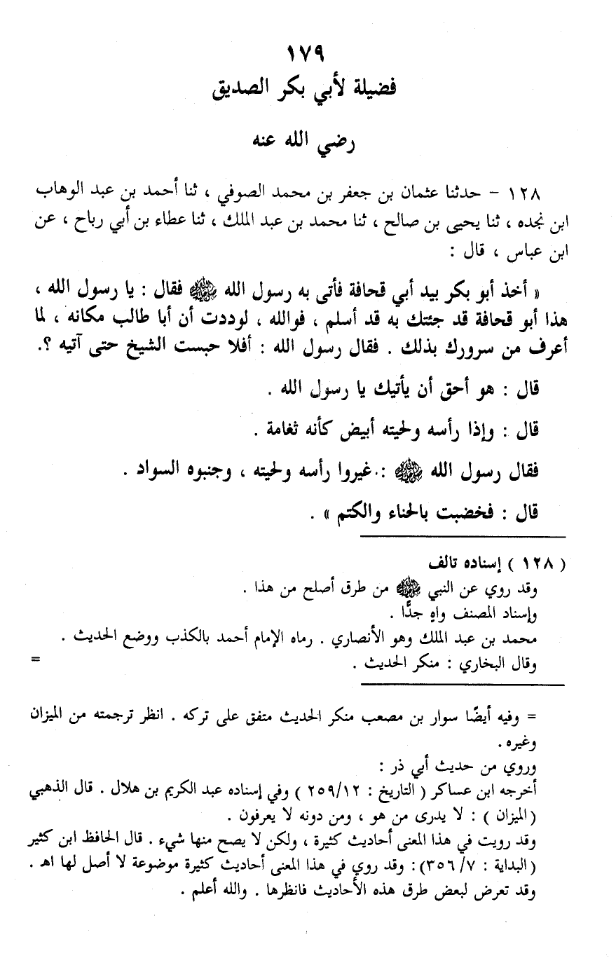 128 - حَدَّثَنَا عُثْمَانُ بْنُ جَعْفَرِ بْنِ مُحَمَّدٍ الصُّوفِيُّ، ثنا أَحْمَدُ بْنُ عَبْدِ الْوَهَّابِ بْنِ نَجْدِهِ، ثنا يَحْيَى بْنُ صَالِحٍ، ثنا مُحَمَّدُ بْنُ عَبْدِ الْمَلِكِ، ثنا عَطَاءُ بْنُ أَبِي رَبَاحٍ، عَنِ ابْنِ عَبَّاسٍ، قَالَ: أَخَذَ أَبُو بَكْرٍ بِيَدِ أَبِي قُحَافَةَ، فَأَتَى بِهِ رَسُولَ اللَّهِ صَلَّى اللهُ عَلَيْهِ وَسَلَّمَ، فَقَالَ: يَا رَسُولَ اللَّهِ، هَذَا أَبُو قُحَافَةَ قَدْ جِئْتُكَ بِهِ قَدْ أَسْلَمَ، فَوَاللَّهِ، لَوَدِدْتُ أَنَّ أَبَا طَالِبٍ مَكَانَهُ، لِمَا أَعْرِفُ مِنْ سُرُورِكَ بِذَلِكَ. فَقَالَ رَسُولُ اللَّهِ: «أَفَلَا حَبَسْتَ الشَّيْخَ حَتَّى آتِيَهُ» ؟ قَالَ: هُوَ أَحَقُّ أَنْ يَأْتِيَكَ يَا رَسُولَ اللَّهِ. قَالَ: وَإِذَا رَأْسُهُ وَلِحْيَتُهُ أَبْيَضُ كَأَنَّهُ ثَغَامَةٌ. فَقَالَ رَسُولُ اللَّهِ صَلَّى اللهُ عَلَيْهِ وَسَلَّمَ: «§غَيِّرُوا رَأْسَهُ وَلِحْيَتَهُ، وَجَنِّبُوهُ السَّوَادَ» . قَالَ: فَخَضَبْتُ بِالْحِنَّاءِ وَالْكَتَمِ -[180]-. وَفِي حَدِيثٍ آخَرَ: جِئْتُ بِأَبِي قُحَافَةَ إِلَى رَسُولِ اللَّهِ صَلَّى اللهُ عَلَيْهِ وَسَلَّمَ، فَقَالَ: «هَلَّا تَرَكْتَ الشَّيْخَ فَآتِيَهُ» ؟ . قُلْتُ: هُوَ أَحَقُّ أَنْ يَأْتِيَكَ، يَا رَسُولَ اللَّهِ. فَقَالَ: «إِنَّا لَنَحْفَظُهُ لِأَيَادٍ لِابْنِهِ عِنْدَنَا» . وَرَوَاهُ أَبُو بَكْرٍ، وَابْنُ عُمَرَ، وَجَابِرٌ، وَأَسْمَاءُ كَذَلِكَ تَفَرَّدَ بِهَذِهِ الْفَضِيلَةِ أَبُو بَكْرٍ الصِّدِّيقُ، لَمْ يُشَارِكْهُ فِيهَا أَحَدُ، وَلَا يُعْلَمُ أَنَّ أَحَدًا مِنَ الْعَشَرَةِ أَسْلَمَ أَبُوهُ عَلَى يَدَيْ رَسُولِ اللَّهِ غَيْرَ أَبِي قُحَافَةَ، وَلَا فِي أَصْحَابِ رَسُولِ اللَّهِ، لَا مِنَ الْأَوَّلِينَ، وَلَا مِنَ الْآخِرِينَ أَرْبَعَةٌ، آبَاؤُهُمْ وَأَبْنَاؤُهُمْ شَهِدُوا رَسُولَ اللَّهِ وَآمَنُوا بِهِ، إِلَّا أَبُو بَكْرٍ وَوَلَدُهُ، فَإِنَّ أَبَاهُ أَسْلَمَ عَلَى يَدَيْ رَسُولِ اللَّهِ صَلَّى اللهُ عَلَيْهِ وَسَلَّمَ، وَاسْمُهُ عُثْمَانُ بْنُ عَامِرِ بْنِ عَمْرِو بْنِ كَعْبِ بْنِ سَعْدِ بْنِ تَيْمِ بْنِ مُرَّةَ، وَابْنُهُ أَبُو بَكْرٍ، وَاسْمُهُ عَبْدُ اللَّهِ، وَيُقَالُ: عَتِيقٌ، وَابْنُهُ عَبْدُ الرَّحْمَنِ بْنُ أَبِي بَكْرٍ، وَابْنُهُ أَبُو عَتِيقِ بْنُ عَبْدِ الرَّحْمَنِ، وَاسْمُهُ مُحَمَّدٌ أَرْبَعَةٌ، كُلُّهُمْ صَحِبُوا رَسُولَ اللَّهِ صَلَّى اللهُ عَلَيْهِ وَسَلَّمَ. حَدَّثَنَاهُ الْمَحَامِلِيُّ، عَنِ الْبُخَارِيِّ، عَنْ عَبْدِ الرَّحْمَنِ بْنِ أَبِي شَيْبَةَ