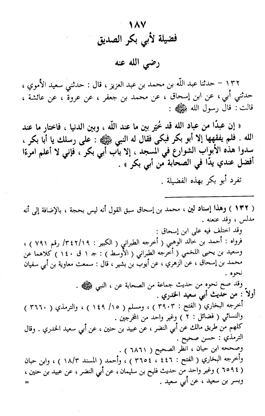 132 - حَدَّثَنَا عَبْدُ اللَّهِ بْنُ مُحَمَّدِ بْنِ عَبْدِ الْعَزِيزِ، قَالَ: حَدَّثَنِي سَعِيدٌ الْأُمَوِيُّ، حَدَّثَنِي أَبِي، عَنِ ابْنِ إِسْحَاقَ، عَنْ مُحَمَّدِ بْنِ جَعْفَرٍ، عَنْ عُرْوَةَ، عَنْ عَائِشَةَ، قَالَتْ: قَالَ رَسُولُ اللَّهِ صَلَّى اللهُ عَلَيْهِ وَسَلَّمَ: «إِنَّ §عَبْدًا مِنْ عِبَادِ اللَّهِ قَدْ خُيِّرَ بَيْنَ مَا عِنْدَ اللَّهِ، وَبَيْنَ الدُّنْيَا، فَاخْتَارَ مَا عِنْدَ اللَّهِ» . فَلَمْ يَفْقَهْهَا إِلَّا أَبُو بَكْرٍ؛ فَبَكَى، فَقَالَ لَهُ النَّبِيُّ صَلَّى اللهُ عَلَيْهِ وَسَلَّمَ: «عَلَى رِسْلِكَ يَا أَبَا بَكْرٍ، سُدُّوا هَذِهِ الْأَبْوَابَ الشَّوَارِعَ فِي الْمَسْجِدِ، إِلَّا بَابَ أَبِي بَكْرٍ، فَإِنِّي لَا أَعْلَمُ امْرَءًا أَفْضَلَ عِنْدِي يَدًا فِي الصَّحَابَةِ مِنْ أَبِي بَكْرٍ» تَفَرَّدَ أَبُو بَكْرٍ بِهَذِهِ الْفَضِيلَةِ.
