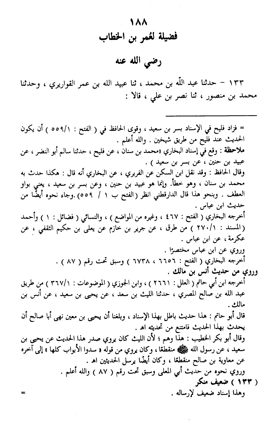 133 - حَدَّثَنَا عَبْدُ اللَّهِ بْنُ مُحَمَّدٍ، ثنا عُبَيْدُ اللَّهِ بْنُ عُمَرَ الْقَوَارِيرِيُّ، وَحَدَّثَنَا مُحَمَّدُ بْنُ مَنْصُورٍ، ثنا نَصْرُ بْنُ عَلِيٍّ، قَالَا -[189]-: ثنا جَرِيرٌ، عَنْ يَعْقُوبَ الْقُمِّيِّ، عَنْ جَعْفَرٍ، عَنْ سَعِيدِ بْنِ جُبَيْرٍ، قَالَ: جَاءَ جِبْرِيلُ إِلَى رَسُولِ اللَّهِ صَلَّى اللهُ عَلَيْهِ وَسَلَّمَ، فَقَالَ: «يَا مُحَمَّدُ، §أَقْرِئْ عُمَرَ السَّلَامَ، وَأَخْبِرْهُ أَنَّ غَضَبَهُ عِزٌّ، وَأَنَّ رِضَاهُ حُكْمٌ» لَفْظُ الْقَوَارِيرِيِّ. تَفَرَّدَ عُمَرُ بْنُ الْخَطَّابِ بِهَذِهِ الْفَضِيلَةِ.