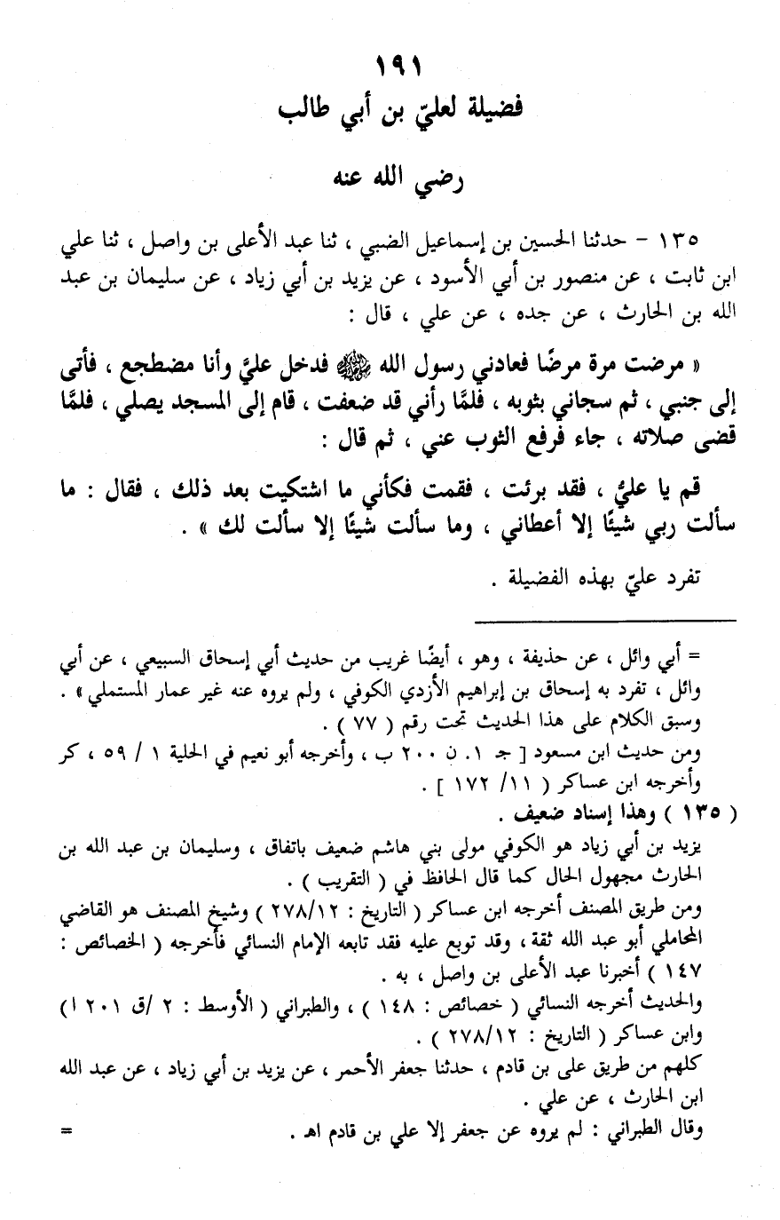 135 - حَدَّثَنَا الْحُسَيْنُ بْنُ إِسْمَاعِيلَ الضَّبِّيُّ، ثنا عَبْدُ الْأَعْلَى بْنُ وَاصِلٍ، ثنا عَلِيُّ بْنُ ثَابِتٍ، عَنْ مَنْصُورِ بْنِ أَبِي الْأَسْوَدِ، عَنْ يَزِيدَ بْنِ أَبِي زِيَادٍ، عَنْ سُلَيْمَانَ بْنِ عَبْدِ اللَّهِ بْنِ الْحَارِثِ، عَنْ جَدِّهِ، عَنْ عَلِيٍّ، قَالَ: مَرِضْتُ مَرَّةً مَرَضًا، فَعَادَنِي رَسُولُ اللَّهِ صَلَّى اللهُ عَلَيْهِ وَسَلَّمَ، فَدَخَلَ عَلَيَّ وَأَنَا مُضْطَجِعٌ، فَأَتَى إِلَى جَنْبِي، ثُمَّ سَجَّانِي بِثَوْبِهِ، فَلَمَّا رَآنِي قَدْ ضَعُفْتُ، قَامَ إِلَى الْمَسْجِدِ يُصَلِّي، فَلَمَّا قَضَى صَلَاتَهُ، جَاءَ فَرَفَعَ الثَّوْبَ عَنِّي، ثُمَّ قَالَ: «§قُمْ يَا عَلِيُّ، فَقَدْ بَرِئْتَ» ، فَقُمْتُ، فَكَأَنِّي مَا اشْتَكَيْتُ بَعْدَ ذَلِكَ، فَقَالَ: «مَا سَأَلْتُ رَبِّي شَيْئًا إِلَّا أَعْطَانِي، وَمَا سَأَلْتُ شَيْئًا إِلَّا سَأَلْتُ لَكَ» تَفَرَّدَ عَلِيٌّ بِهَذِهِ الْفَضِيلَةِ.