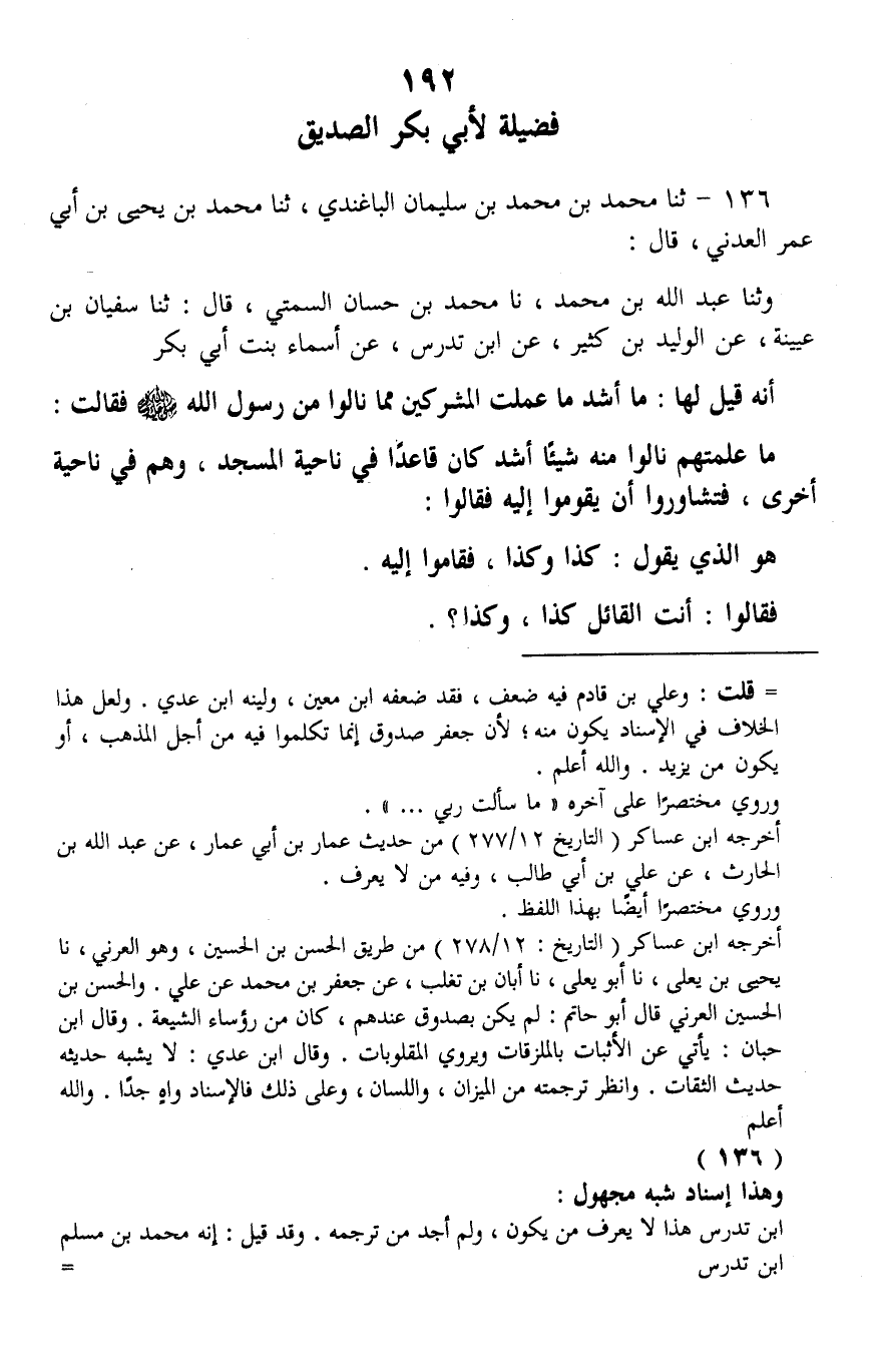 136 - ثنا مُحَمَّدُ بْنُ مُحَمَّدِ بْنِ سُلَيْمَانَ الْبَاغَنْدِيُّ، ثنا مُحَمَّدُ بْنُ يَحْيَى بْنِ أَبِي عُمَرَ الْعَدَنِيُّ، قَالَ: وَثنا عَبْدُ اللَّهِ بْنُ مُحَمَّدٍ، نا مُحَمَّدُ بْنُ حَسَّانَ السَّمْتِيُّ، قَالَ: ثنا سُفْيَانُ بْنُ عُيَيْنَةَ، عَنِ الْوَلِيدِ بْنِ كَثِيرٍ، عَنِ ابْنِ تَدْرُسَ، عَنْ أَسْمَاءَ بِنْتِ أَبِي بَكْرٍ، أَنَّهُ قِيلَ لَهَا: مَا أَشَدُّ مَا عَلِمْتِ الْمُشْرِكِينَ مِمَّا نَالُوا مِنْ رَسُولِ اللَّهِ صَلَّى اللهُ عَلَيْهِ وَسَلَّمَ؟ فَقَالَتْ: مَا عَلِمْتُهُمْ نَالُوا مِنْهُ شَيْئًا أَشَدَّ كَانَ قَاعِدًا فِي نَاحِيَةِ الْمَسْجِدِ، وَهُمْ فِي نَاحِيَةٍ أُخْرَى، فَتَشَاوَرُوا أَنْ يَقُومُوا إِلَيْهِ فَقَالُوا: هُوَ الَّذِي يَقُولُ: كَذَا وَكَذَا. فَقَامُوا إِلَيْهِ. فَقَالُوا: أَنْتَ الْقَائِلُ كَذَا، وَكَذَا؟ -[193]-. فَقَالَ: «نَعَمْ» . فَقَالُوهَا ثَلَاثَ مَرَّاتٍ، وَهُوَ يَرُدُّ عَلَيْهِمْ نَعَمْ، فَأَخَذُوهُ، فَجَعَلُوا يَضْرِبُونَهُ وَيَمُدُّونَهُ بَيْنَهُمْ، فَجَاءَتِ الصَّيْحَةُ إِلَى أَبِي بَكْرٍ، وَهُوَ بَيْنَ أَظْهُرِهِمْ أَنْ أَدْرِكْ صَاحِبَكَ، قَدْ أَخَذُوهُ. فَخَرَجَ أَبُو بَكْرٍ مِنْ عِنْدِنَا، وَلَهُ أَرْبَعُ غَدَائِرَ، فَلَمَّا رَآهُ بَيْنَ أَظْهُرِهِمْ قَالَ: وَيْلَكُمْ، {§أَتَقْتُلُونَ رَجُلًا أَنْ يَقُولَ رَبِّيَ اللَّهُ وَقَدْ جَاءَكُمْ بِالْبَيِّنَاتِ مِنْ رَبِّكُمْ} [غافر: 28] ؟ قَالَ: ثُمَّ دَخَلَ بَيْنَهُمْ، فَخَلَّصَهُ مِنْهُمْ، وَأَقْبَلُوا عَلَى أَبِي بَكْرٍ، فَجَعَلُوا يَضْرِبُونَهُ وَيَمُدُّونَهُ. قَالَتْ: فَخَرَجَ إِلَيْنَا، فَجَعَلْنَا نَقُولُ بِالْغَدِيرَةِ هَكَذَا - يَعْنِي نُحَرِّكُهَا - فَتَجِيءُ كَمَا هِيَ، وَهُوَ يَقُولُ: تَبَارَكْتَ يَا ذَا الْجَلَالِ وَالْإِكْرَامِ " تَفَرَّدَ أَبُو بَكْرٍ بِهَذِهِ الْفَضِيلَةِ.
