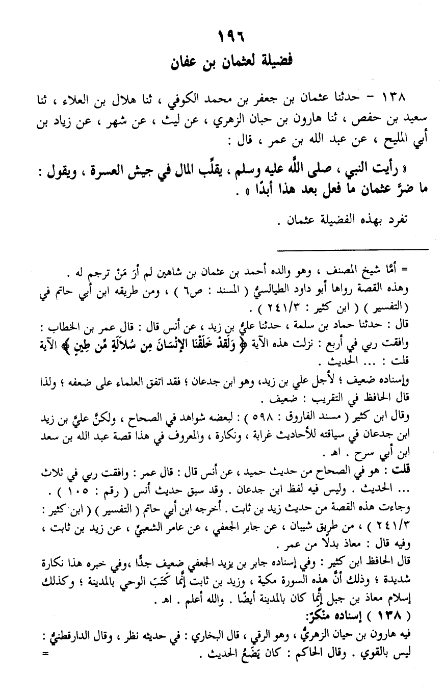 138 - حَدَّثَنَا عُثْمَانُ بْنُ جَعْفَرِ بْنِ مُحَمَّدِ الْكُوفِيُّ، ثنا هِلَالُ بْنُ الْعَلَاءِ، ثنا سَعِيدُ بْنُ حَفْصٍ، ثنا هَارُونُ بْنُ حَيَّانَ الزُّهْرِيُّ، عَنْ لَيْثٍ، عَنْ شَهْرٍ، عَنْ زِيَادِ بْنِ أَبِي الْمَلِيحِ، عَنْ عَبْدِ اللَّهِ بْنِ عُمَرَ، قَالَ: رَأَيْتُ النَّبِيَّ صَلَّى اللهُ عَلَيْهِ وَسَلَّمَ يُقَلِّبُ الْمَالَ فِي جَيْشِ الْعُسْرَةِ، وَيَقُولُ: §«مَا ضَرَّ عُثْمَانَ مَا فَعَلَ بَعْدَ هَذَا أَبَدًا» تَفَرَّدَ بِهَذِهِ الْفَضِيلَةِ عُثْمَانَ.