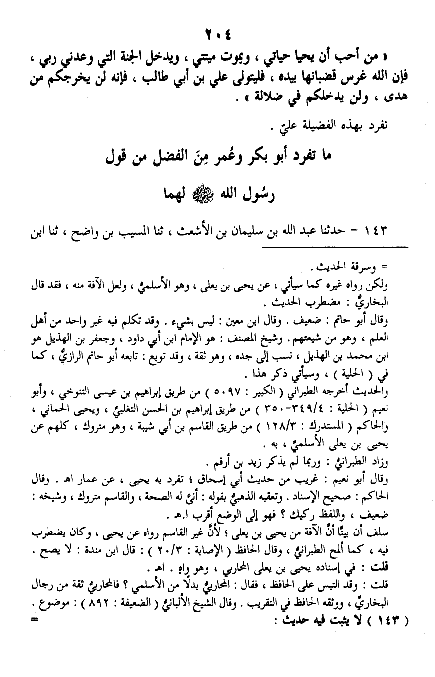 143 - حَدَّثَنَا عَبْدُ اللَّهِ بْنُ سُلَيْمَانَ بْنِ الْأَشْعَثَ، ثنا الْمُسَيِّبُ بْنُ وَاضِحٍ، ثنا ابْنُ -[205]- عُيَيْنَةَ، عَنْ فِرَاسٍ، عَنِ الشَّعْبِيِّ، عَنِ الْحَارِثِ، عَنْ عَلِيٍّ، قَالَ: كُنْتُ عِنْدَ رَسُولِ اللَّهِ صَلَّى اللهُ عَلَيْهِ وَسَلَّمَ، فَأَقْبَلَ أَبُو بَكْرٍ، وَعُمَرُ، فَقَالَ: «يَا عَلِيُّ، §هَذَانِ سَيِّدَا كُهُولِ أَهْلِ الْجَنَّةِ مِنَ الْأَوَّلِينَ وَالْآخِرِينَ، مَا خَلَا النَّبِيِّينَ وَالْمُرْسَلِينَ، وَلَا تُخْبِرْهُمَا يَا عَلِيُّ» . تَفَرَّدَ أَبُو بَكْرٍ وَعُمَرُ بِهَذِهِ الْفَضِيلَةِ.