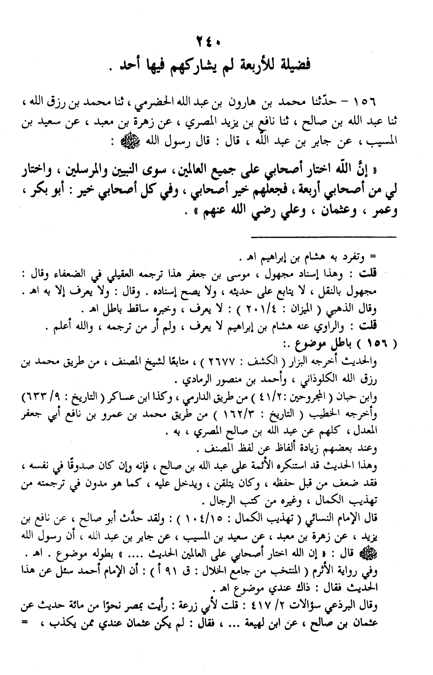 156 - حَدَّثَنَا مُحَمَّدُ بْنُ هَارُونَ بْنِ عَبْدِ اللَّهِ الْحَضْرَمِيُّ، ثنا مُحَمَّدُ بْنُ رِزْقِ اللَّهِ، ثنا عَبْدُ اللَّهِ بْنُ صَالِحٍ، ثنا نَافِعُ بْنُ يَزِيدَ الْمِصْرِيُّ، عَنْ زُهْرَةَ بْنِ مَعْبَدٍ، عَنْ سَعِيدِ بْنِ الْمُسَيِّبِ، عَنْ جَابِرِ بْنِ عَبْدِ اللَّهِ، قَالَ: قَالَ رَسُولُ اللَّهِ صَلَّى اللهُ عَلَيْهِ وَسَلَّمَ: " إِنَّ §اللَّهَ اخْتَارَ أَصْحَابِي عَلَى جَمِيعِ الْعَالَمِينَ، سِوَى النَّبِيِّينَ وَالْمُرْسَلِينَ، وَاخْتَارَ لِي مِنْ أَصْحَابِي أَرْبَعَةً، فَجَعَلَهُمْ خَيْرَ أَصْحَابِي، وَفِي كُلَّ أَصْحَابِي خَيْرُ: أَبُو بَكْرٍ، وَعُمَرُ، وَعُثْمَانُ، وَعَلِيٌّ رَضِيَ اللَّهُ عَنْهُمْ