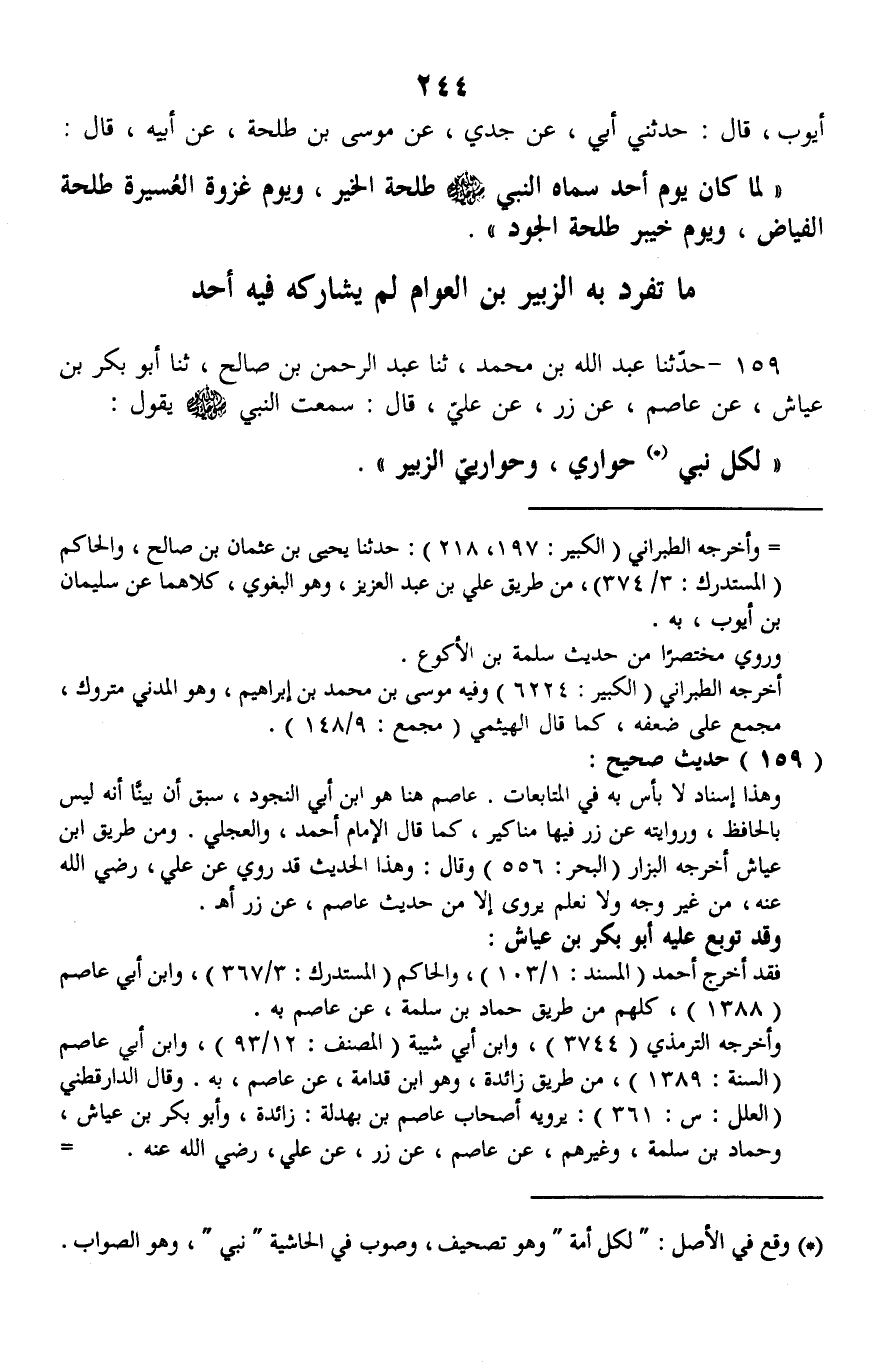 159 - حَدَّثَنَا عَبْدُ اللَّهِ بْنُ مُحَمَّدٍ، ثنا عَبْدُ الرَّحْمَنِ بْنُ صَالِحٍ، ثنا أَبُو بَكْرِ بْنُ عَيَّاشٍ، عَنْ عَاصِمٍ، عَنْ زِرٍّ، عَنْ عَلِيٍّ، قَالَ: سَمِعْتُ النَّبِيَّ صَلَّى اللهُ عَلَيْهِ وَسَلَّمَ يَقُولُ: §«لِكُلِّ نَبِيٍّ حَوَارِيُّ، وَحَوَارِيِّي الزُّبَيْرُ»
