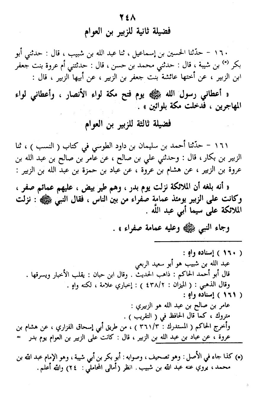161 - حَدَّثَنَا أَحْمَدُ بْنُ سُلَيْمَانَ بْنِ دَاوُدَ الطُّوسِيُّ، فِي كِتَابِ النَّسَبِ، ثنا الزُّبَيْرُ بْنُ بَكَّارٍ، قَالَ: وَحَدَّثَنِي عَلِيُّ بْنُ صَالِحٍ، عَنْ عَامِرِ بْنِ صَالِحِ بْنِ عَبْدِ اللَّهِ بْنِ عُرْوَةَ بْنِ الزُّبَيْرِ، عَنْ هِشَامِ بْنِ عُرْوَةَ، عَنْ عَبَّادِ بْنِ حَمْزَةَ بْنِ عَبْدِ اللَّهِ بْنِ الزُّبَيْرِ، أَنَّهُ بَلَغَهُ أَنَّ الْمَلَائِكَةَ، نَزَلَتْ يَوْمَ بَدْرٍ، وَهُمْ طَيْرٌ بِيضٌ، عَلَيْهِمْ عَمَائِمُ صُفْرٌ، وَكَانَتْ عَلَى الزُّبَيْرِ يَوْمَئِذٍ عِمَامَةٌ صَفْرَاءُ مِنْ بَيْنِ النَّاسِ، فَقَالَ النَّبِيُّ صَلَّى اللهُ عَلَيْهِ وَسَلَّمَ: §«نَزَلَتِ الْمَلَائِكَةُ عَلَى سِيَّمَا أَبِي عَبْدِ اللَّهِ» . وَجَاءَ النَّبِيُّ صَلَّى اللهُ عَلَيْهِ وَسَلَّمَ وَعَلَيْهِ عِمَامَةٌ صَفْرَاءُ