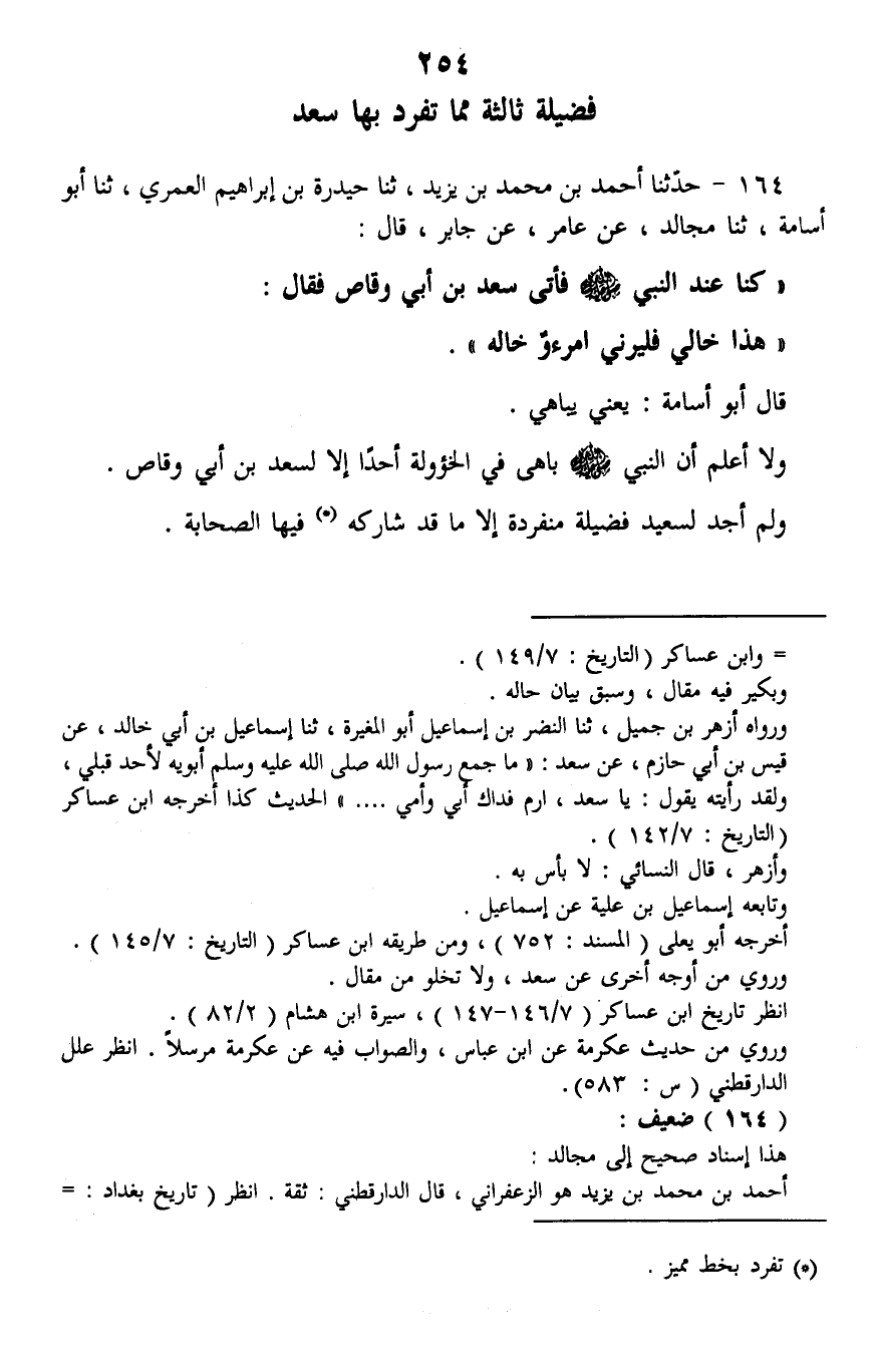164 - حَدَّثَنَا أَحْمَدُ بْنُ مُحَمَّدِ بْنِ يَزِيدَ، ثنا حَيْدَرَةُ بْنُ إِبْرَاهِيمَ الْعُمَرِيُّ، ثنا أَبُو أُسَامَةَ، ثنا مُجَالِدٌ، عَنْ عَامِرٍ، عَنْ جَابِرٍ، قَالَ: كُنَّا عِنْدَ النَّبِيِّ صَلَّى اللهُ عَلَيْهِ وَسَلَّمَ، فَأَتَى سَعْدُ بْنُ أَبِي وَقَّاصٍ، فَقَالَ: «§هَذَا خَالِي، فَلْيُرِنِي امْرُؤٌ خَالَهُ» . قَالَ أَبُو أُسَامَةَ: «يَعْنِي يُبَاهِي. وَلَا أَعْلَمُ أَنَّ النَّبِيَّ صَلَّى اللهُ عَلَيْهِ وَسَلَّمَ بَاهَى فِي الْخُؤُولَةِ أَحَدًا إِلَّا لِسَعْدِ بْنِ أَبِي وَقَّاصٍ» وَلَمْ أَجِدْ لِسَعِيدٍ فَضِيلَةً مُنْفَرِدَةً إِلَّا مَا قَدْ شَارَكَهُ فِيهَا الصَّحَابَةُ.