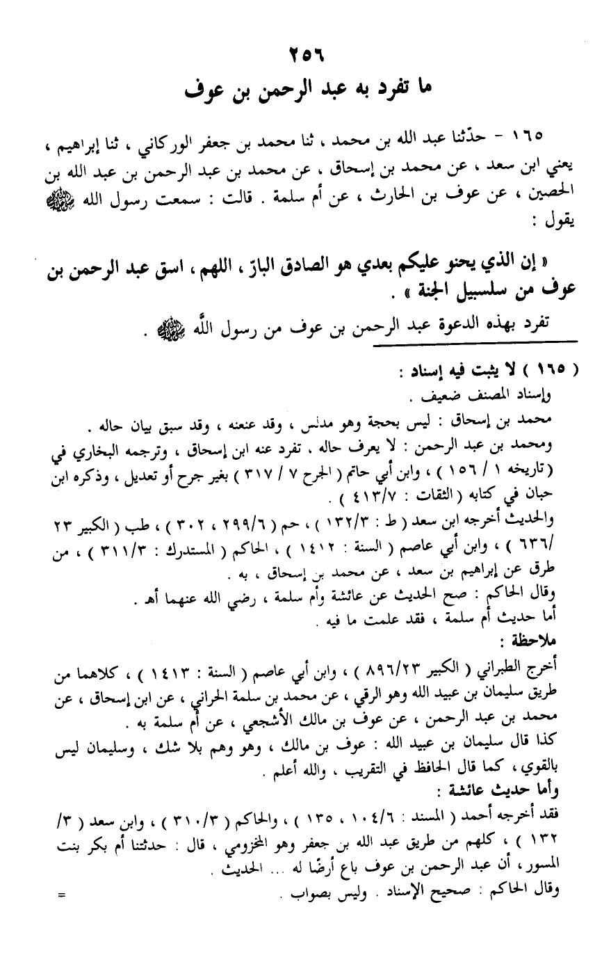 165 - حَدَّثَنَا عَبْدُ اللَّهِ بْنُ مُحَمَّدٍ، ثنا مُحَمَّدُ بْنُ جَعْفَرٍ الْوَرْكَانِيُّ، ثنا إِبْرَاهِيمُ، يَعْنِي ابْنَ سَعْدٍ عَنْ مُحَمَّدِ بْنِ إِسْحَاقَ، عَنْ مُحَمَّدِ بْنِ عَبْدِ الرَّحْمَنِ بْنِ عَبْدِ اللَّهِ بْنِ الْحُصَيْنِ، عَنْ عَوْفِ بْنِ الْحَارِثِ، عَنْ أُمِّ سَلَمَةَ، قَالَتْ: سَمِعْتُ رَسُولَ اللَّهِ صَلَّى اللهُ عَلَيْهِ وَسَلَّمَ يَقُولُ: «إِنَّ §الَّذِي يَحْنُو عَلَيْكُمْ بَعْدِي هُوَ الصَّادِقُ الْبَارُّ، اللَّهُمَّ اسْقِ عَبْدَ الرَّحْمَنِ بْنَ عَوْفٍ مِنْ سَلْسَبِيلِ الْجَنَّةِ» تَفَرَّدَ بِهَذِهِ الدَّعْوَةِ عَبْدُ الرَّحْمَنِ بْنُ عَوْفٍ مِنْ رَسُولِ اللَّهِ صَلَّى اللهُ عَلَيْهِ وَسَلَّمَ.
