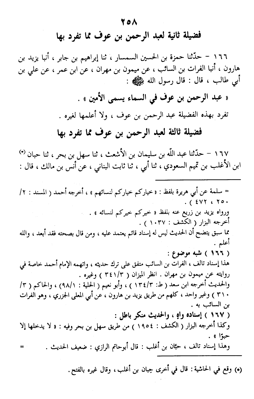 166 - حَدَّثَنَا حَمْزَةُ بْنُ الْحُسَيْنِ السِّمْسَارُ، ثنا إِبْرَاهِيمُ بْنُ جَابِرٍ، أنبا يَزِيدُ بْنُ هَارُونَ، أنبا الْفُرَاتُ بْنُ السَّائِبِ، عَنْ مَيْمُونِ بْنِ مِهْرَانَ، عَنِ ابْنِ عُمَرَ، عَنْ عَلِيِّ بْنِ أَبِي طَالِبٍ، قَالَ: قَالَ رَسُولُ اللَّهِ صَلَّى اللهُ عَلَيْهِ وَسَلَّمَ: §«عَبْدُ الرَّحْمَنِ بْنُ عَوْفٍ فِي السَّمَاءِ يُسَمَّى الْأَمِينَ» تَفَرَّدَ بِهَذِهِ الْفَضِيلَةِ عَبْدُ الرَّحْمَنِ بْنُ عَوْفٍ، وَلَا أَعْلَمُهَا لِغَيْرِهِ.