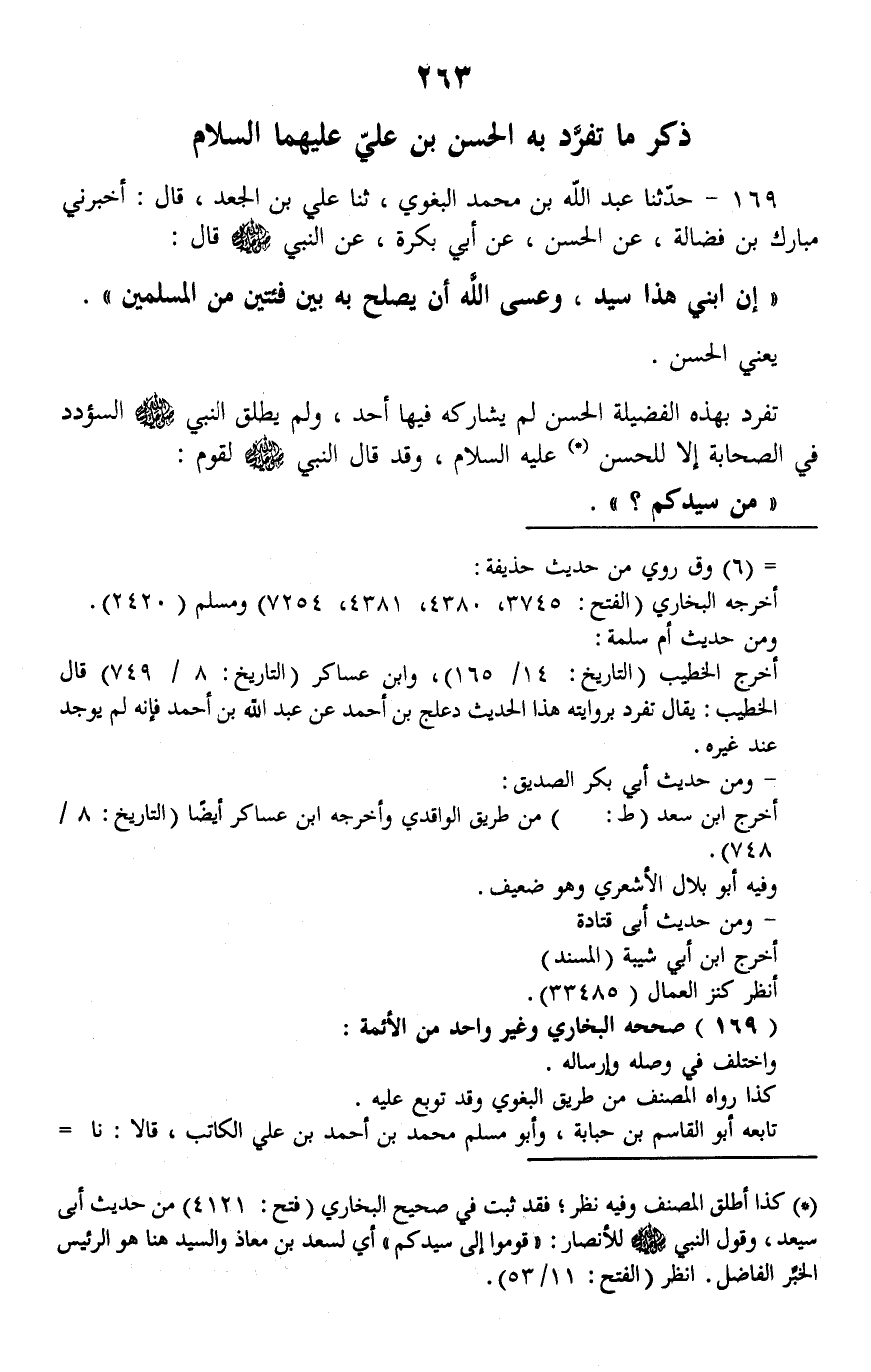 169 - حَدَّثَنَا عَبْدُ اللَّهِ بْنُ مُحَمَّدِ الْبَغَوِيُّ، ثنا عَلِيُّ بْنُ الْجَعْدِ، قَالَ: أَخْبَرَنِي مُبَارَكُ بْنُ فَضَالَةَ، عَنِ الْحَسَنِ، عَنْ أَبِي بَكْرَةَ، عَنِ النَّبِيِّ صَلَّى اللهُ عَلَيْهِ وَسَلَّمَ قَالَ: «إِنَّ §ابْنِي هَذَا سَيِّدٌ، وَعَسَى اللَّهُ أَنْ يُصْلِحَ بِهِ بَيْنَ فِئَتَيْنِ مِنَ الْمُسْلِمِينَ» يَعْنِي الْحَسَنَ تَفَرَّدَ بِهَذِهِ الْفَضِيلَةِ الْحَسَنُ، لَمْ يُشَارِكْهُ فِيهَا أَحَدُ، وَلَمْ يُطْلِقِ النَّبِيُّ صَلَّى اللهُ عَلَيْهِ وَسَلَّمَ السُّؤْدَدَ فِي الصَّحَابَةِ إِلَّا لِلْحَسَنِ عَلَيْهِ السَّلَامُ، وَقَدْ قَالَ النَّبِيُّ صَلَّى اللهُ عَلَيْهِ وَسَلَّمَ لِقَوْمٍ: «مَنْ سَيِّدِكُمْ» ؟ -[264]- فَقَالُوا: الْجَدُّ بْنُ قَيْسٍ. وَلَيْسَ يُشْبِهُ هَذَا؛ لِأَنَّ هَذَا أَطْلَقَهُ عَلَى أَنَّهُ سَيِّدٌ مِنْ أَهْلِ الْبَيْتِ، وَسَيِّدٌ فِي الصَّحَابَةِ، وَلَمْ يَلْحَقْ بِهَذَا شَرَفٌ بَتَّةً.