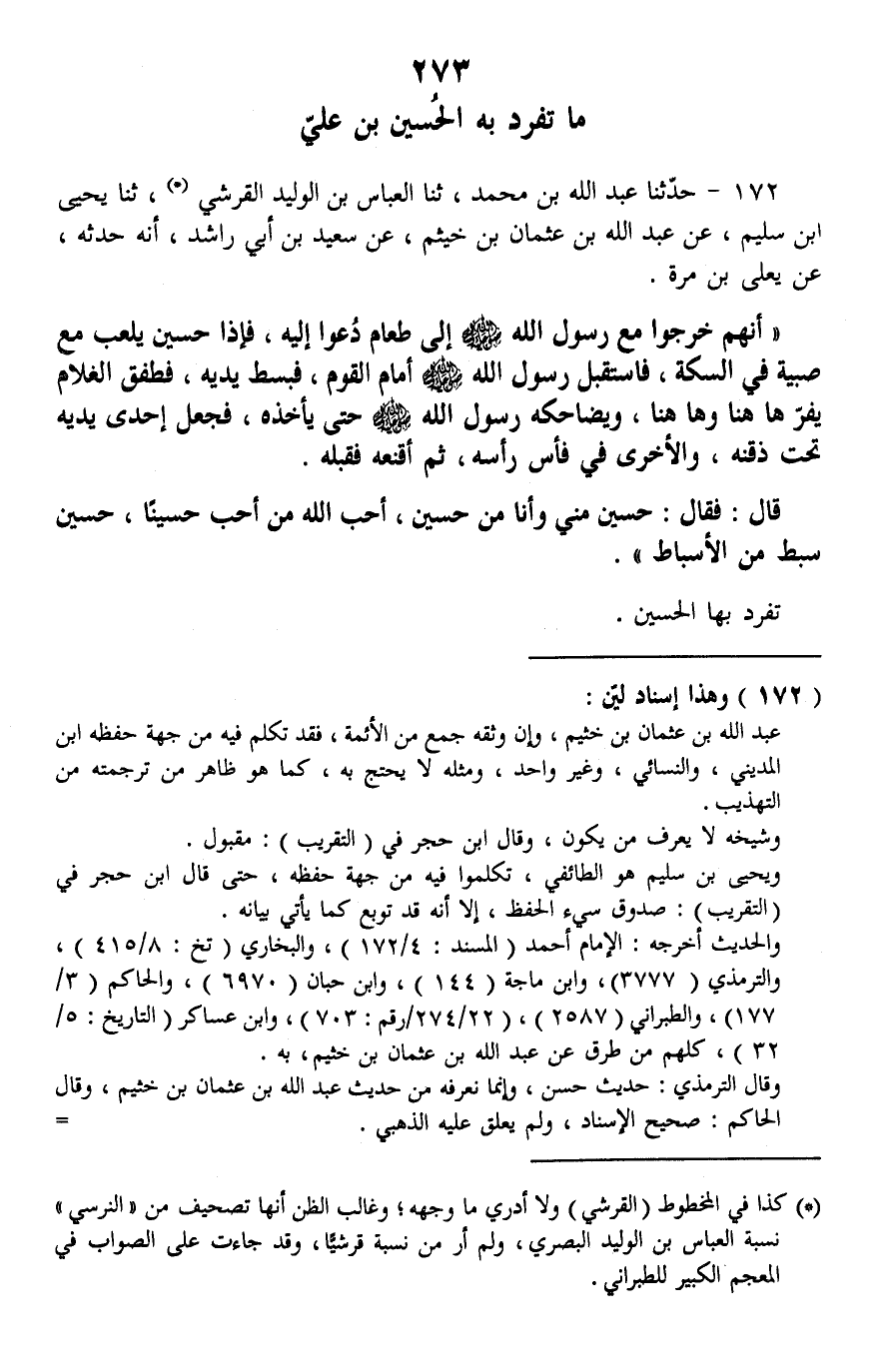 172 - حَدَّثَنَا عَبْدُ اللَّهِ بْنُ مُحَمَّدٍ، ثنا الْعَبَّاسُ بْنُ الْوَلِيدِ النَّرْسِيُّ، ثنا يَحْيَى بْنُ سُلَيْمٍ، عَنْ عَبْدِ اللَّهِ بْنِ عُثْمَانَ بْنِ خُثَيْمٍ، عَنْ سَعِيدِ بْنِ أَبِي رَاشِدٍ، أَنَّهُ حَدَّثَهُ عَنْ يَعْلَى بْنِ مُرَّةَ، أَنَّهُمْ خَرَجُوا مَعَ رَسُولِ اللَّهِ صَلَّى اللهُ عَلَيْهِ وَسَلَّمَ إِلَى طَعَامٍ دُعُوا إِلَيْهِ، فَإِذَا حُسَيْنٌ يَلْعَبُ مَعَ صِبْيَةٍ فِي السِّكَّةِ، فَاسْتَقْبَلَ رَسُولُ اللَّهِ صَلَّى اللهُ عَلَيْهِ وَسَلَّمَ أَمَامَ الْقَوْمِ، فَبَسَطَ يَدَيْهِ، فَطَفِقَ الْغُلَامُ يَفِرُّ هَاهُنَا وَهَاهُنَا، وَيُضَاحِكُهُ رَسُولُ اللَّهِ صَلَّى اللهُ عَلَيْهِ وَسَلَّمَ حَتَّى يَأْخُذَهُ، فَجَعَلَ إِحْدَى يَدَيْهِ تَحْتَ ذَقْنِهِ، وَالْأُخْرَى فِي فَأْسِ رَأْسِهِ، ثُمَّ أَقْنَعَهُ، فَقَبَّلَهُ. قَالَ: فَقَالَ: «§حُسَيْنٌ مِنِّي وَأَنَا مِنْ حُسَيْنٍ، أَحَبَّ اللَّهُ مَنْ أَحَبَّ حُسَيْنًا، حُسَيْنٌ سِبْطٌ مِنَ الْأَسْبَاطِ» تَفَرَّدَ بِهَا الْحُسَيْنُ.