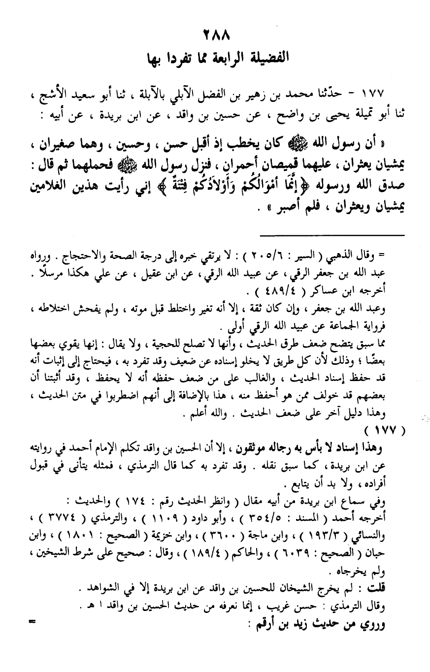 177 - حَدَّثَنَا مُحَمَّدُ بْنُ زُهَيْرِ بْنِ الْفَضْلِ الْآبِلِيُّ، بِالْآبِلَةِ، ثنا أَبُو سَعِيدٍ الْأَشَجُّ، ثنا أَبُو تُمَيْلَةَ يَحْيَى بْنُ وَاضِحٍ، عَنْ حُسَيْنِ بْنِ وَاقِدٍ، عَنِ ابْنِ بُرَيْدَةَ، عَنْ أَبِيهِ، أَنَّ رَسُولَ اللَّهِ صَلَّى اللهُ عَلَيْهِ وَسَلَّمَ كَانَ يَخْطُبُ إِذْ أَقْبَلَ حَسَنٌ، وَحُسَيْنٌ، وَهُمَا صَغِيرَانِ، يَمْشِيَانِ يَعْثُرَانِ، عَلَيْهِمَا قَمِيصَانِ أَحْمَرَانِ، فَنَزَلَ رَسُولُ اللَّهِ صَلَّى اللهُ عَلَيْهِ وَسَلَّمَ، فَحَمَلَهُمَا، ثُمَّ قَالَ: «§صَدَقَ اللَّهُ وَرَسُولُهُ» {إِنَّمَا أَمْوَالُكُمْ وَأَوْلَادُكُمْ فِتْنَةٌ} [التغابن: 15] «إِنِّي رَأَيْتُ هَذَيْنِ الْغُلَامَيْنِ يَمْشِيَانِ وَيَعْثُرَانِ، فَلَمْ أَصْبِرْ»