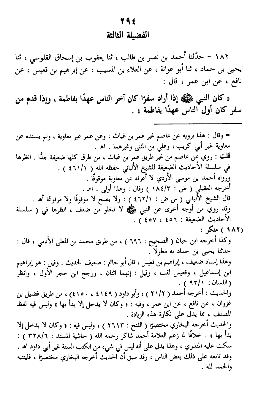 182 - حَدَّثَنَا أَحْمَدُ بْنُ نَصْرِ بْنِ طَالِبٍ، ثنا يَعْقُوبُ بْنُ إِسْحَاقَ الْقُلُوسِيُّ، ثنا يَحْيَى بْنُ حَمَّادٍ، ثنا أَبُو عَوَانَةَ، عَنِ الْعَلَاءِ بْنِ الْمُسَيِّبِ، عَنْ إِبْرَاهِيمَ بْنِ قُعَيْسٍ، عَنْ نَافِعٍ، عَنِ ابْنِ عُمَرَ، قَالَ: كَانَ النَّبِيُّ صَلَّى اللهُ عَلَيْهِ وَسَلَّمَ §أَذَا أَرَادَ سَفَرًا كَانَ آخِرَ النَّاسِ عَهْدًا بِفَاطِمَةَ، وَإِذَا قَدِمَ مِنْ سَفَرٍ كَانَ أَوَّلَ النَّاسِ عَهْدًا بِفَاطِمَةَ "