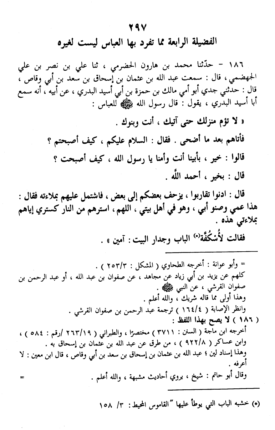 186 - حَدَّثَنَا مُحَمَّدُ بْنُ هَارُونَ الْحَضْرَمِيُّ، ثنا عَلِيُّ بْنُ نَصْرِ بْنِ عَلِيٍّ الْجَهْضَمِيُّ، قَالَ: سَمِعْتُ عَبْدَ اللَّهِ بْنَ عُثْمَانَ بْنِ إِسْحَاقَ بْنِ سَعْدِ بْنِ أَبِي وَقَّاصٍ، قَالَ: حَدَّثَنِي جَدِّي أَبُو أُمِّي، مَالِكُ بْنُ حَمْزَةَ بْنِ أَبِي أُسَيْدٍ الْبَدْرِيُّ، عَنْ أَبِيهِ، أَنَّهُ سَمِعَ أَبَا أُسَيْدٍ الْبَدْرِيَّ، يَقُولُ: قَالَ رَسُولُ اللَّهِ صَلَّى اللهُ عَلَيْهِ وَسَلَّمَ لِلْعَبَّاسِ: «§لَا تَؤُمَّ مَنْزِلَكَ حَتَّى آتِيَكَ، أَنْتَ وَبَنُوكَ» . فَأَتَاهُمْ بَعْدَ مَا أَضْحَى، فَقَالَ: «السَّلَامُ عَلَيْكُمْ، كَيْفَ أَصْبَحْتُمْ» ؟ قَالُوا: خَيْرٌ، بِأَبِينَا أَنْتَ وَأَمِّنَّا يَا رَسُولَ اللَّهِ، كَيْفَ أَصْبَحْتَ؟ قَالَ: «بِخَيْرٍ، وَالْحَمْدُ لِلَّهِ» . قَالَ: «ادْنُوَا تَقَارَبُوا، يَزْحَفُ بَعْضُكُمْ إِلَى بَعْضٍ» . فَاشْتَمَلَ عَلَيْهِمْ بِمِلَاءَتِهِ، فَقَالَ: «هَذَا عَمِّي وَصِنْوُ أَبِي، وَهُوَ فِي أَهْلِ بَيْتِي، اللَّهُمَّ اسْتَرْهُمْ مِنَ النَّارِ كَسَتْرِي إِيَّاهُمْ بِمِلَاءَتِي هَذِهِ» . فَقَالَتْ أُسْكُفَّةُ الْبَابِ وَجِدَارُ الْبَيْتِ: آمِينَ