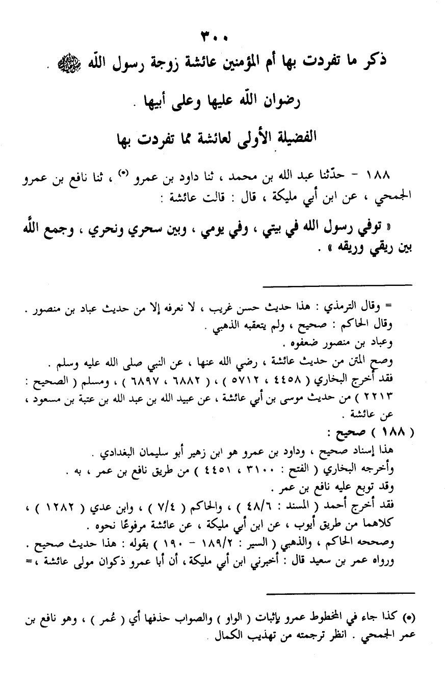 188 - حَدَّثَنَا عَبْدُ اللَّهِ بْنُ مُحَمَّدٍ، ثنا دَاوُدُ بْنُ عَمْرٍو، ثنا نَافِعُ بْنُ عَمْرٍو الْجُحَمِيُّ، عَنِ ابْنِ أَبِي مُلَيْكَةَ، قَالَ: قَالَتْ عَائِشَةُ: «§تُوُفِّيَ رَسُولُ اللَّهِ فِي بَيْتِي، وَفِي يَوْمِي، وَبَيْنَ سَحْرِي وَنَحْرِي، وَجَمَعَ اللَّهُ بَيْنَ رِيقِي، وَرِيقِهِ»