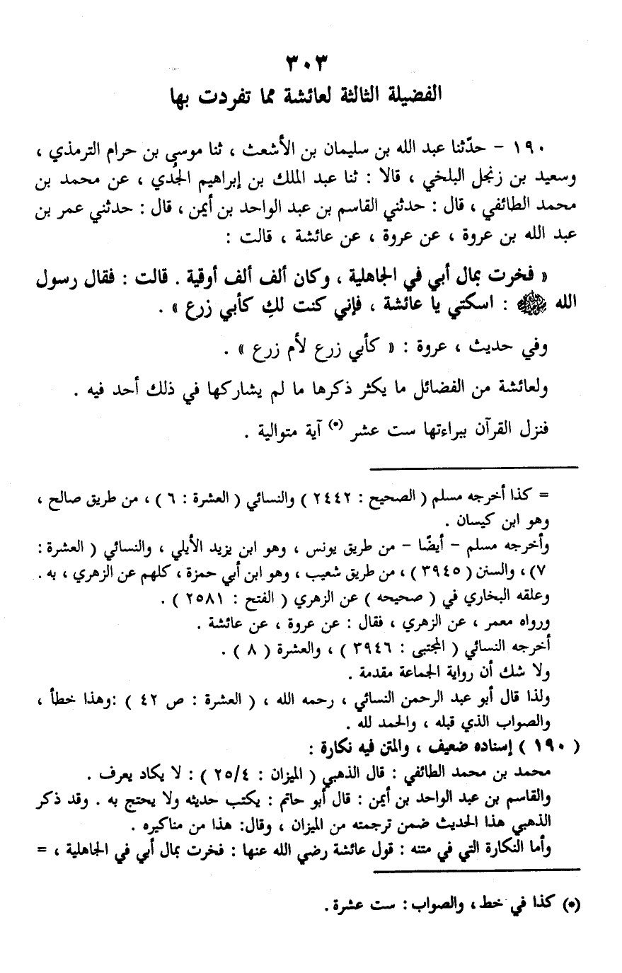 190 - حَدَّثَنَا عَبْدُ اللَّهِ بْنُ سُلَيْمَانَ بْنِ الْأَشْعَثَ، ثنا مُوسَى بْنُ حِزَامٍ التِّرْمِذِيُّ، وَسَعِيدُ بْنُ زَنْجَلٍ الْبَلْخِيُّ، قَالَا: ثنا عَبْدُ الْمَلِكِ بْنُ إِبْرَاهِيمَ الْجُدِّيُّ، عَنْ مُحَمَّدِ بْنِ مُحَمَّدٍ الطَّائِفِيِّ، قَالَ: حَدَّثَنِي الْقَاسِمُ بْنُ عَبْدِ الْوَاحِدِ بْنِ أَيْمَنَ، قَالَ: حَدَّثَنِي عُمَرُ بْنُ عَبْدِ اللَّهِ بْنِ عُرْوَةَ، عَنْ عُرْوَةَ، عَنْ عَائِشَةَ، قَالَتْ: فَخَرْتُ بِمَالِ أَبِي فِي الْجَاهِلِيَّةِ، وَكَانَ أَلْفَ أَلْفَ أُوقِيَّةٍ. قَالَتْ: فَقَالَ رَسُولُ اللَّهِ صَلَّى اللهُ عَلَيْهِ وَسَلَّمَ: «§اسْكُتِي يَا عَائِشَةُ، فَإِنِّي كُنْتُ لَكِ كَأَبِي زَرْعٍ» . وَفِي حَدِيثِ عُرْوَةَ: «كَأَبِي زَرْعٍ لِأُمَّ زَرْعٍ» ولِعَائِشَةَ مِنَ الْفَضَائِلِ مَا يَكْثُرُ ذِكْرُهَا مَا لَمْ يُشَارِكْهَا فِي ذَلِكَ أَحَدُ فِيهِ. فَنَزَلَ الْقُرْآنُ بِبَرَاءَتِهَا سِتَّ عَشْرَةَ آيَةً مُتَوَالِيَةً -[304]-. وَمِنْهُ تَوَاتُرُ مِزَاحُ النَّبِيِّ صَلَّى اللهُ عَلَيْهِ وَسَلَّمَ مَعَهَا بِأَشْيَاءَ كَثِيرَةٍ. وَمِنْهُ بِدَالَتُهَا عَلَيْهِ بِكَلَامٍ لَمْ يُفْصِحْ بِهِ أَحَدٌ لِرَسُولِ اللَّهِ. وَمِنْهُ أَنَّهُ أَجْمَعَ أَكْثَرُ أَصْحَابِ رَسُولِ اللَّهِ صَلَّى اللهُ عَلَيْهِ وَسَلَّمَ أَنَّهَا كَانَتْ مِنْ أَحَبِّ الْخَلْقِ إِلَى رَسُولِ اللَّهِ صَلَّى اللهُ عَلَيْهِ وَسَلَّمَ، كَمَا رَوَتْهُ أُمُّ سَلَمَةَ، وَعَمَّارٌ، وَغَيْرُهَمَا، وَمِنْهُ قَوْلُ النَّبِيِّ صَلَّى اللهُ عَلَيْهِ وَسَلَّمَ: «فَضْلُ عَائِشَةَ عَلَى النِّسَاءِ كَفَضْلِ الثَّرِيدِ عَلَى سَائِرِ الطَّعَامِ» . وَمِنْهُ سِبَاقُ النَّبِيِّ صَلَّى اللهُ عَلَيْهِ وَسَلَّمَ لَهَا. وَمِنْهُ أَنَّهَا سَمِعَتْهُ يَقُولُ فِي يَوْمٍ مِنَ الْأَيَّامِ فَقَدَهَا، فَقَالَ: «وَاعَرُوسَاهْ» . فَجَمَعَهَا اللَّهُ عَزَّ وَجَلَّ عَلَيْهِ، وَغَيْرُ ذَلِكَ.