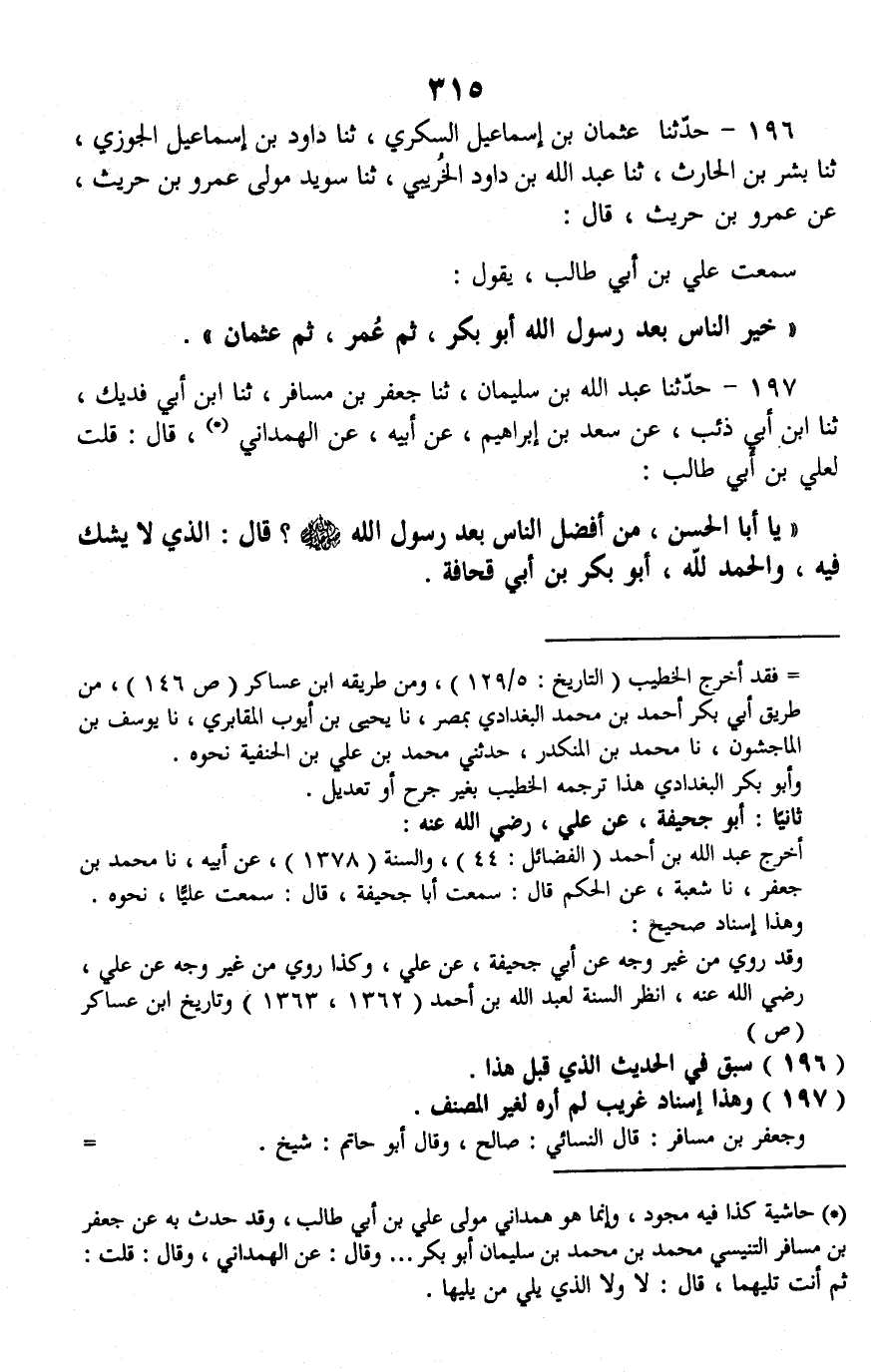 197 - حَدَّثَنَا عَبْدُ اللَّهِ بْنُ سُلَيْمَانَ، ثنا جَعْفَرُ بْنُ مُسَافِرٍ، ثنا ابْنُ أَبِي فُدَيْكٍ، ثنا ابْنُ أَبِي ذِئْبٍ، عَنْ سَعْدِ بْنِ إِبْرَاهِيمَ، عَنْ أَبِيهِ، عَنِ الْهَمْدَانِيِّ، قَالَ: قُلْتُ لِعَلِيِّ بْنِ أَبِي طَالِبٍ: يَا أَبَا الْحَسَنِ، §مَنْ أَفْضَلُ النَّاسِ بَعْدَ رَسُولِ اللَّهِ صَلَّى اللهُ عَلَيْهِ وَسَلَّمَ؟ قَالَ: «الَّذِي لَا يُشَكُّ فِيهِ، وَالْحَمْدُ لِلَّهِ، أَبُو بَكْرِ بْنُ أَبِي قُحَافَةَ» -[316]-. قَالَ: قُلْتُ: ثُمَّ مَنْ يَا أَبَا الْحَسَنِ؟ قَالَ: «الَّذِي لَا يُشَكُّ فِيهِ، وَالْحَمْدُ لِلَّهِ، عُمَرُ بْنُ الْخَطَّابِ»
