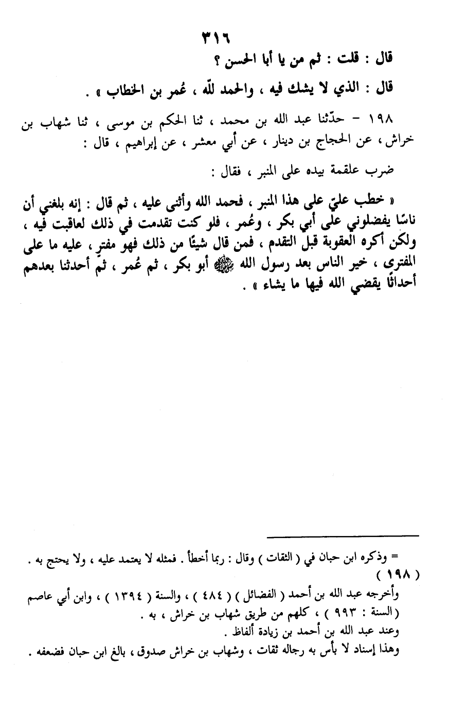 198 - حَدَّثَنَا عَبْدُ اللَّهِ بْنُ مُحَمَّدٍ، ثنا الْحَكَمُ بْنُ مُوسَى، ثنا شِهَابُ بْنُ خِرَاشٍ، عَنِ الْحَجَّاجِ بْنِ دِينَارٍ، عَنْ أَبِي مَعْشَرٍ، عَنْ إِبْرَاهِيمَ، قَالَ: ضَرَبَ عَلْقَمَةُ بِيَدِهِ عَلَى الْمِنْبَرِ، فَقَالَ: خَطَبَ عَلِيٌّ عَلَى هَذَا الْمِنْبَرِ، فَحَمِدَ اللَّهَ وَأَثْنَى عَلَيْهِ، ثُمَّ قَالَ: «إِنَّهُ بَلَغَنِي أَنَّ نَاسًا يُفَضِّلُونِي عَلَى أَبِي بَكْرٍ، وَعُمَرَ، فَلَوْ كُنْتُ تَقَدَّمْتُ فِي ذَلِكَ لَعَاقَبْتُ فِيهِ، وَلَكِنْ أَكْرَهُ الْعُقُوبَةَ قَبْلَ التَّقَدُّمِ، فَمَنْ قَالَ شَيْئًا مِنْ ذَلِكَ فَهُوَ مُفْتَرٍ، عَلَيْهِ مَا عَلَى الْمُفْتَرِي. §خَيْرُ النَّاسِ بَعْدَ رَسُولِ اللَّهِ صَلَّى اللهُ عَلَيْهِ وَسَلَّمَ أَبُو بَكْرٍ، ثُمَّ عُمَرُ، ثُمَّ أَحْدَثْنَا بَعْدَهُمْ أَحْدَاثًا، يَقْضِي اللَّهُ فِيهَا مَا شَاءَ»
