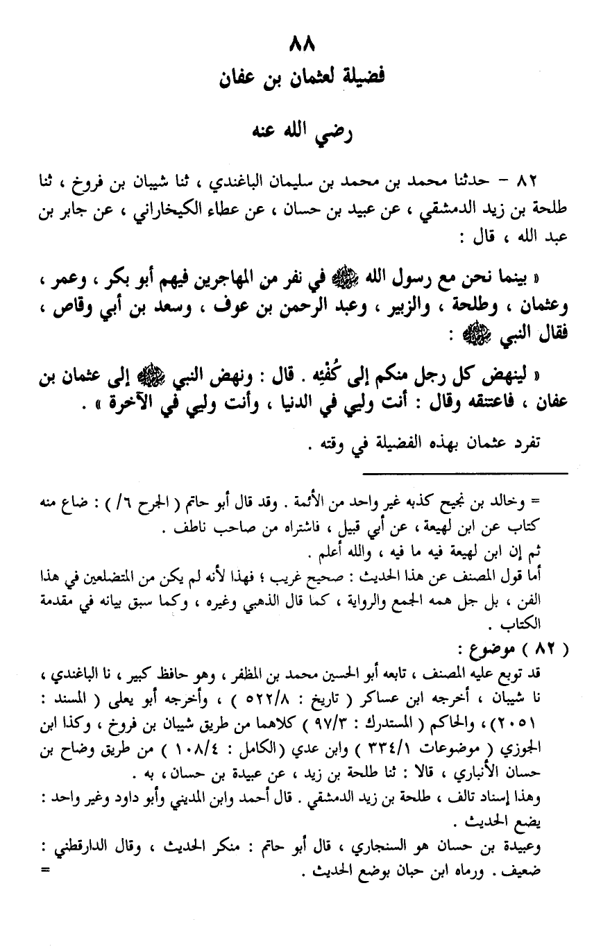 82 - حَدَّثَنَا مُحَمَّدُ بْنُ مُحَمَّدِ بْنِ سُلَيْمَانَ الْبَاغَنْدِيُّ، ثنا شَيْبَانُ بْنُ فَرُّوخَ، ثنا طَلْحَةُ بْنُ زَيْدٍ الدِّمَشْقِيُّ، عَنْ عُبَيْدةَ بْنِ حَسَّانَ، عَنْ عَطَاءٍ الْكَيْخَارَانِيِّ، عَنْ جَابِرِ بْنِ عَبْدِ اللَّهِ، قَالَ: بَيْنَمَا نَحْنُ مَعَ رَسُولِ اللَّهِ صَلَّى اللهُ عَلَيْهِ وَسَلَّمَ فِي نَفَرٍ مِنَ الْمُهَاجِرِينَ، فِيهِمْ أَبُو بَكْرٍ، وَعُمَرُ، وَعُثْمَانُ، وَطَلْحَةُ، وَالزُّبَيْرُ، وَعَبْدُ الرَّحْمَنِ بْنُ عَوْفٍ، وَسَعْدُ بْنُ أَبِي وَقَّاصٍ، فَقَالَ النَّبِيُّ صَلَّى اللهُ عَلَيْهِ وَسَلَّمَ: «§لِيَنْهَضْ كُلُّ رَجُلٍ مِنْكُمْ إِلَى كُفْئِهِ» . قَالَ: وَنَهَضَ النَّبِيُّ صَلَّى اللهُ عَلَيْهِ وَسَلَّمَ إِلَى عُثْمَانَ بْنِ عَفَّانَ، فَاعْتَنَقَهُ، وَقَالَ: «أَنْتَ وَلِيِّي فِي الدُّنْيَا، وَأَنْتَ وَلِيِّي فِي الْآخِرَةِ» تَفَرَّدَ عُثْمَانُ بِهَذِهِ الْفَضِيلَةِ فِي وَقْتِهِ
