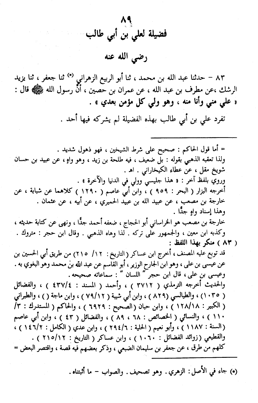 83 - حَدَّثَنَا عَبْدُ اللَّهِ بْنُ مُحَمَّدٍ، ثنا أَبُو الرَّبِيعٍ الزَّهْرَانِيُّ، ثنا جَعْفَرٌ، ثنا يَزِيدُ الرِّشْكِ، عَنْ مُطَرِّفِ بْنِ عَبْدِ اللَّهِ، عَنْ عِمْرَانَ بْنِ حُصَيْنٍ، أَنَّ رَسُولَ اللَّهِ صَلَّى اللهُ عَلَيْهِ وَسَلَّمَ قَالَ: «§عَلِيٌّ مِنِّي وَأَنَا مِنْهُ، وَهُوَ وَلِيُّ كُلِّ مُؤْمِنٍ بَعْدِي» تَفَرَّدَ عَلِيُّ بْنُ أَبِي طَالِبٍ بِهَذِهِ الْفَضِيلَةِ، لَمْ يَشْرَكْهُ فِيهَا أَحَدٌ