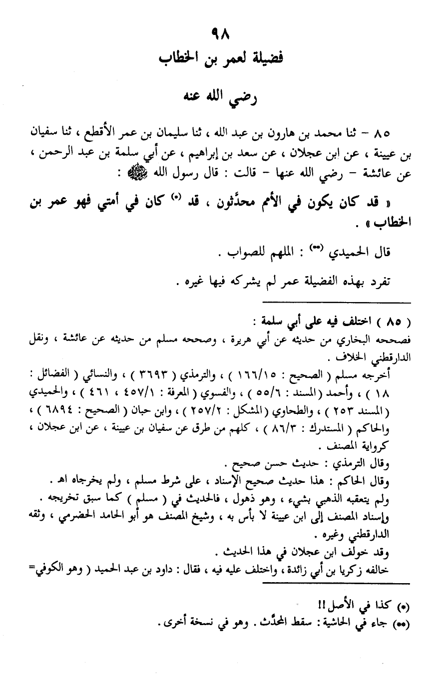 85 - ثنا مُحَمَّدُ بْنُ هَارُونَ بْنِ عَبْدِ اللَّهِ، ثنا سُلَيْمَانُ بْنُ عُمَرَ الْأَقْطَعُ، ثنا سُفْيَانُ بْنُ عُيَيْنَةَ، عَنِ ابْنِ عَجْلَانَ، عَنْ سَعْدِ بْنِ إِبْرَاهِيمَ، عَنْ أَبِي سَلَمَةَ بْنِ عَبْدِ الرَّحْمَنِ، عَنْ عَائِشَةَ، رَضِيَ اللَّهُ عَنْهَا قَالَتْ: قَالَ رَسُولُ اللَّهِ صَلَّى اللهُ عَلَيْهِ وَسَلَّمَ: «§قَدْ كَانَ يَكُونُ فِي الْأُمَمِ مُحَدَّثُونَ، قَدْ كَانَ فِي أُمَّتِي فَهُوَ عُمَرُ بْنُ الْخَطَّابِ» . قَالَ الْحُمَيْدِيُّ: الْمُلْهَمُ لِلصَّوَابِ. تَفَرَّدَ بِهَذِهِ الْفَضِيلَةِ عُمَرُ، لَمْ يَشْرَكْهُ فِيهَا غَيْرُهُ