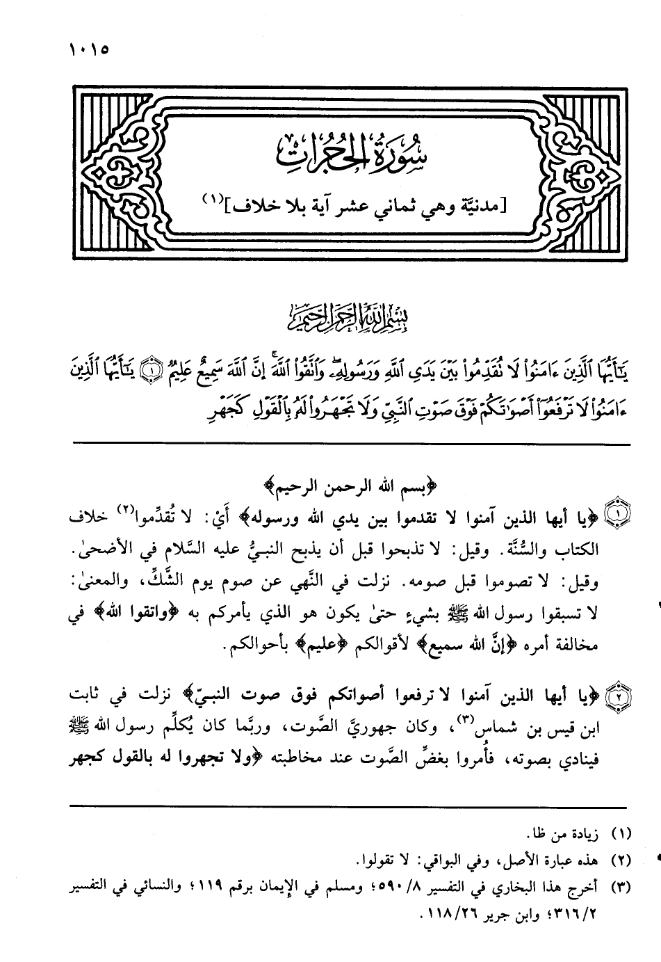 {وإن طائفتان من المؤمنين اقتتلوا} نزلت في جمعين من الأنصار كان بينهما قتالٌ بالأيدي والنِّعال {فأصلحوا بينهما} بالدُّعاءِ إلى حكم كتاب الله فإن بغت إحداهما على الأخرى أَيْ: تعدَّت إحداهما على الأخرى وعدلت عن الحقِّ {فقاتلوا} الباغية حتى ترجع إلى أمر الله في كتابه {فإن فاءت} رجعت إلى الحقِّ {فأصلحوا بينهما} بحملهما على الإِنصاف {وأقسطوا} وأعدلوا {إنَّ الله يحب المقسطين}
