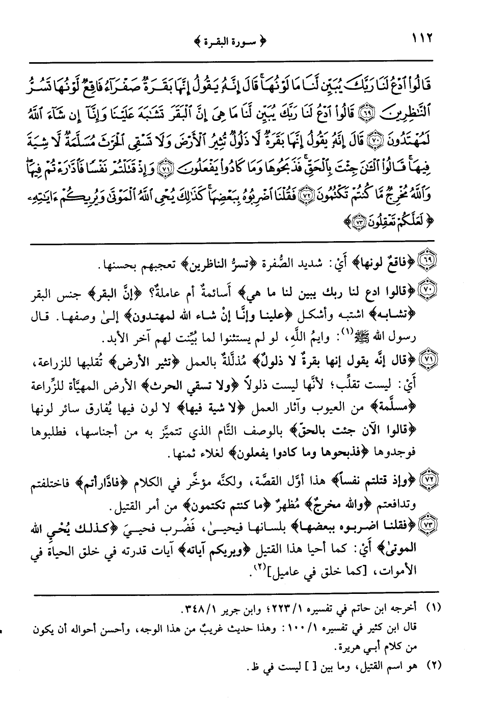 {قَالَ إِنَّهُ يَقُولُ إِنَّهَا بَقَرَةٌ لا ذَلُولٌ} مُذلَّلةٌ بالعمل {تثير الأرض} تُقلبها للزراعة أَيْ: ليستْ تقلِّب لأنَّها ليست ذلولاً {ولا تسقي الحرث} الأرض المهيَّأة للزِّراعة {مسلَّمة} من العيوب وآثار العمل {لا شية فيها} لا لون فيها يُفارق سائر لونها {قالوا الآن جئت بالحقّ} بالوصف التّام الذي تتميَّز به من أجناسها فطلبوها فوجدوها {فذبحوها وما كادوا يفعلون} لغلاء ثمنها