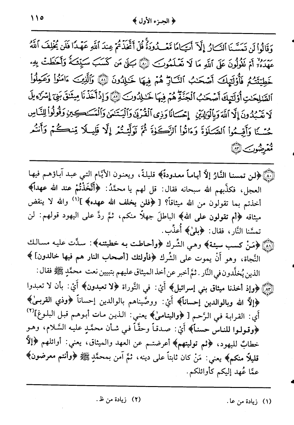 {مَنْ كسب سيئة} وهي الشِّرك {وأحاطت به خطيئته} : سدَّت عليه مسالك النَّجاة وهو أّنْ يموت على الشِّرك {فأولئك أصحاب النار هم فيها خالدون} الذين يُخلَّدون في النَّار ثمَّ أخبر عن أخذ الميثاق عليهم بتبيين نعت محمَّدٍ صلى الله عليه وسلم فقال: