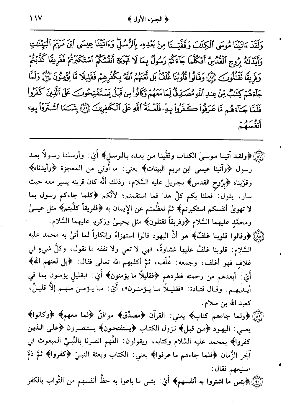 {وَلَقَدْ آتَيْنَا مُوسَى الْكِتَابَ وَقَفَّيْنَا مِنْ بَعْدِهِ بالرسل} أَيْ: وأرسلنا رسولاً بعد رسول {وآتينا عيسى ابن مريم البينات} يعني: ما أُوتي من المعجزة {وأيدناه} وقوَّيناه {بِرُوحِ القدس} بجبريل عليه السَّلام وذلك أنَّه كان قرينه يسير معه حيث سار يقول: فعلنا بكم كلَّ هذا فما استقمتم لأنَّكم {كلما جَاءَكُمْ رَسُولٌ بِمَا لا تَهْوَى أَنْفُسُكُمُ اسْتَكْبَرْتُمْ} ثمَّ تعظَّمتم عن الإِيمان به {ففريقاً كذَّبتم} مثل عيسى ومحمَّدٍ عليهما السَّلام {وفريقاً تقتلون} مثل يحيى وزكريا عليهما السَّلام