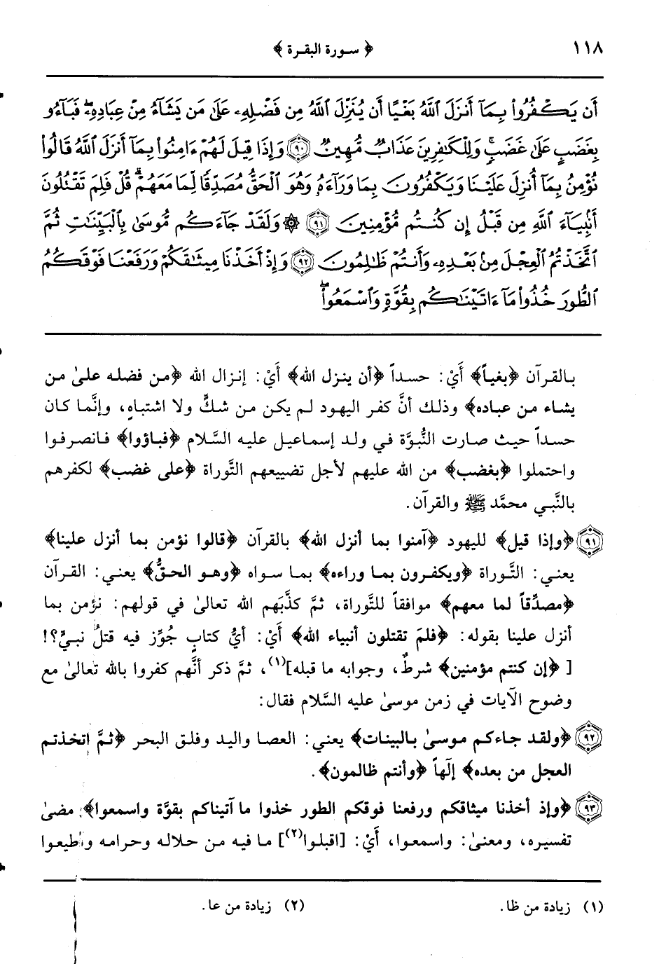 {وَإِذْ أَخَذْنَا مِيثَاقَكُمْ وَرَفَعْنَا فَوْقَكُمُ الطُّورَ خُذُوا ما آتيناكم بقوَّة واسمعوا} مضى تفسيره ومعنى: واسمعوا أَيْ: اقبلوا ما فيه من حلاله وحرامه وأطيعوا {قالوا سمعنا} ما فِيهِ {وعصينا} ما أُمرنا به {وأُشربوا في قلوبهم العجل} وسُقوا حبَّ العجل وخُلطوا بحبِّ العجل حتى اختلط بهم والمعنى: حُبَّب إليهم العجل {بكفرهم} باعتقادهم التَّشبيه لأنَّهم طلبوا ما يُتَصَوَّرُ فِي نفوسهم {قُلْ بِئْسَمَا يَأْمُرُكُمْ بِهِ إِيمَانُكُمْ إِنْ كنتم مؤمنين} هذا تكذيبٌ لهم في قولهم: نؤمن بما أنزل علينا وذلك أن آبائهم ادَّعوا الإِيمان ثمَّ عبدوا العجل فقيل لهم: بئس الإيمان إيمانٌ يأمركم بالكفر والمعنى: لو كنتم مؤمنين ما عبدتم العجل يعني: آبائهم كذلك أنتم لو كنتم مؤمنين بما أُنزل عليكم ما كذَّبتم محمَّداً