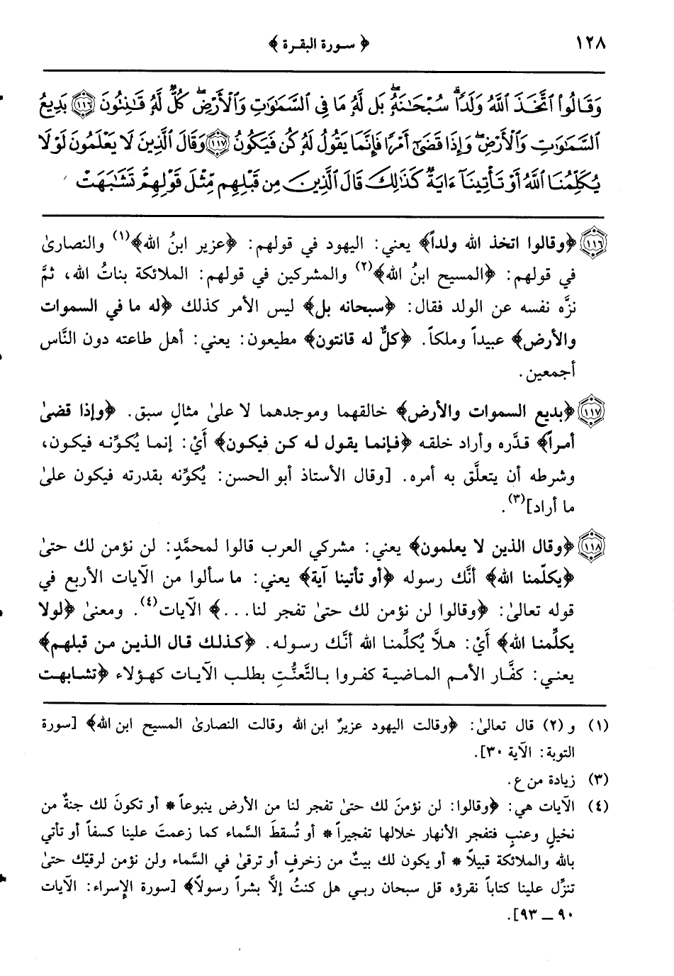 {وقال الذين لا يعلمون} يعني: مشركي العرب قالوا لمحمَّدٍ: لن نؤمن لك حتى {يكلّمنا الله} أنَّك رسوله {أو تأتينا آية} يعني: ما سألوا من الآيات الأربع في قوله تعالى: {وَقَالُوا لَنْ نُؤْمِنَ لَكَ حَتَّى تَفْجُرَ لَنَا} ومعنى {لولا يكلِّمنا الله} أَيْ: هلاَّ يُكلِّمنا الله أنَّك رسوله {كذلك قال الذين من قبلهم} يعني: كفَّار الأمم الماضية كفروا بالتَّعنُّتِ بطلب الآيات كهؤلاء {تشابهت قلوبهم} أشبه بعضها بعضاً فِي الكفر والقسوة ومسألة المحال {قد بيَّنا الآيات لقوم يوقنون} أَيْ: مَنْ أيقن وطلب الحقَّ فقد أتته الآيات لأنَّ القرآن برهانٌ شافٍ