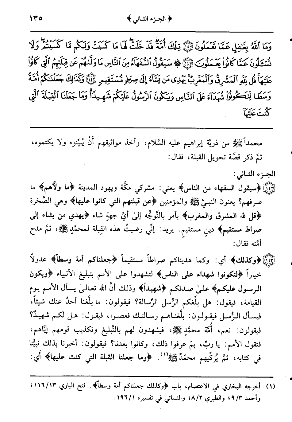 {وكذلك} أي: وكما هديناكم صراطاً مستقيماً {جعلناكم أمة وسطاً} عدولاً خياراً {لتكونوا شهداء على الناس} لتشهدوا على الأمم بتبليغ الأنبياء {ويكون الرسول عليكم} على صدقكم {شهيداً} وذلك أنَّ الله تعالى يسأل الأمم يوم القيامة فيقول: هل بلَّغكم الرُّسل الرِّسالة؟ فيقولون: ما بلَّغنا أحدٌ عنك شيئاً فيسأل الرُّسل فيقولون: بلَّغناهم رسالتك فعصوا فيقول: هل لكم شهيدٌ؟ فيقولون: نعم أمة محمد صلى الله عليه وسلم فيشهدون لهم بالتِّبليغ وتكذيب قومهم إيَّاهم فتقول الأمم: يارب بمَ عرفوا ذلك وكانوا بعدنا؟ فيقولون: أخبرنا بذلك نبيُّنا في كتابه ثمَّ يزكيهم محمد صلى الله عليه وسلم {وَمَا جَعَلْنَا الْقِبْلَةَ الَّتِي كُنْتَ عَلَيْهَا} أَي: التي أنتَ عليها اليوم وهي الكعبةُ قِبلةً {إلاَّ لنعلم} لنرى وقيل: معناه: لنميّز {مَنْ يتبع الرسول} في تصديقه بنسخ القِبلة {ممن ينقلب على عقبيه} يرتدُّ ويرجع إلى الكفر وذلك أنَّ الله تعالى جعل نسخ القبلة عن الصَّخرة إلى الكعبة ابتلاءً لعباده المؤمنين فمَنْ عصمه صدَّق الرَّسول في ذلك ومَنْ لم يعصمه شكَّ في دينه وتردَّد عليه أمره وظنَّ أنَّ محمداً صلى الله عليه وسلم في حيرةٍ من أمره فارتدَّ عن الإِسلام وهذا معنى قوله: {وَإِنْ كَانَتْ لَكَبِيرَةً} أَيْ: وقد كانت التَّولية إلى الكعبة لثقيلةً إِلا {عَلَى الَّذِينَ هَدَى الله} عصمهم الله بالهداية فلمَّا حوِّلت القبلة قالت اليهود: فكيف بمَنْ مات منكم وهو يصلِّي على القبلة الأولى؟ لقد مات على الضَّلالة فَأَنْزَلَ اللَّهُ تَعَالَى: {وَمَا كَانَ اللَّهُ لِيُضِيعَ إيمانكم} أَيْ: صلاتكم التي صليتم وتصديقكم بالقِبلة الأولى {إنَّ الله بالناس} يعني: بالمؤمنين {لرؤوف رحيم} والرَّأفة أشدُّ الرَّحمة