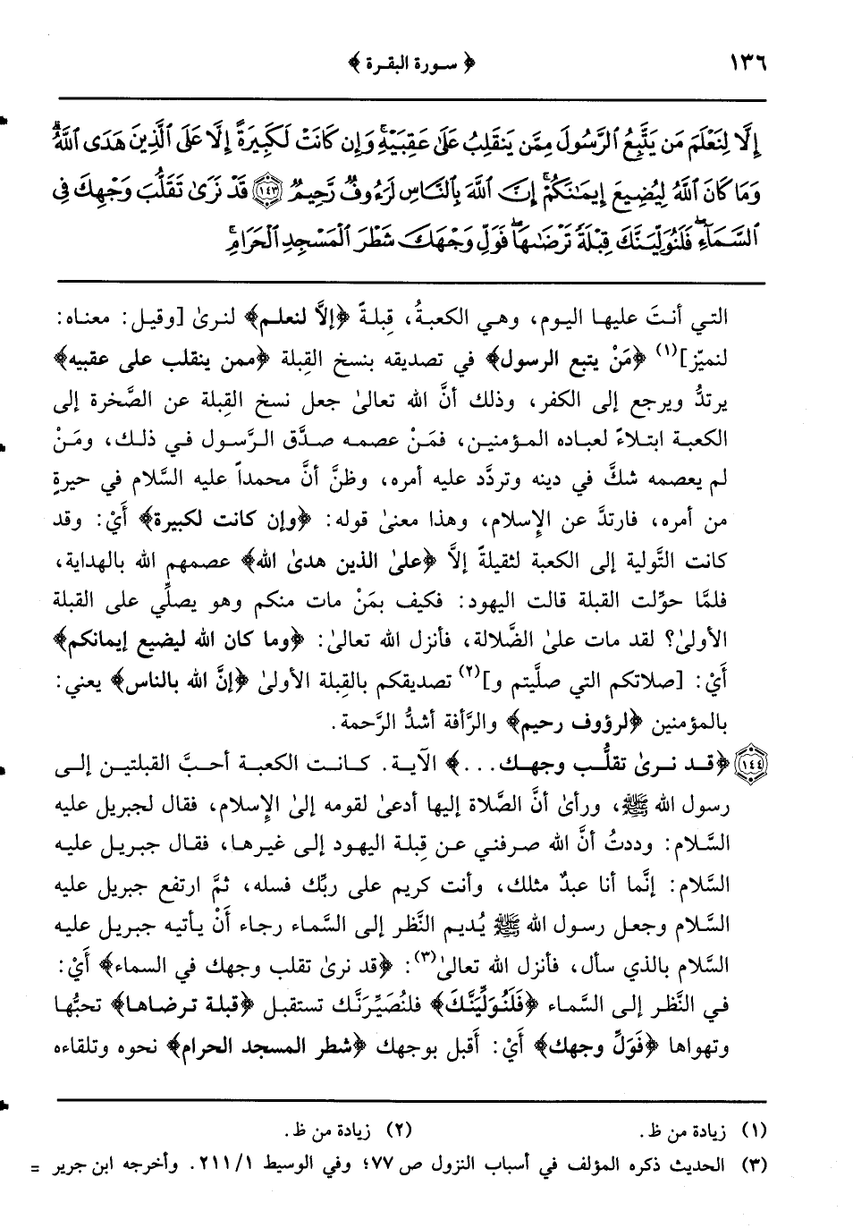 {قد نرى تقلب وجهك} كانت الكعبة أحبَّ القبلتين إلى رسول الله ورأى أنَّ الصَّلاة إليها أدعى لقومه إلى الإسلام فقال لجبريل عليه السَّلام: وددتُ أنَّ الله صرفني عن قِبلة اليهود إلى غيرها فقال جبريل عليه السَّلام: إنَّما أنا عبدٌ مثلك وأنت كريم على ربِّك فسله ثمَّ ارتفع جبريل عليه السَّلام وجعل رسول الله صلى الله عليه وسلم يُديم النَّظر إلى السَّماء رجاء أَنْ يأتيه جبريل عليه السَّلام بالذي سأل فأنزل الله تعالى: {قَدْ نَرَى تَقَلُّبَ وَجْهِكَ فِي السَّمَاءِ} أَيْ: فِي النَّظر إلى السَّماء {فَلَنُوَلِّيَنَّكَ} فلنُصَيِّرَنَّك تستقبل {قبلة ترضاها} تحبُّها وتواها {فَوَلِّ وجهك} أَيْ: أَقبل بوجهك {شطر المسجد الحرام} نحوه وتلقاءه {وَحَيْثُ مَا كُنْتُمْ} فِي برٍّ أو بحرٍ وأردتم الصَّلاة {فولوا وجوهكم شطره} فلمَّا تحوَّلت القِبلة إِلى الكعبة قالت اليهود: يا محمد ما أُمرتَ بهذا وإنَّما هو شيءٌ تبتدعه من تلقاء نفسك فأنزل الله تعالى: {وَإِنَّ الَّذِينَ أُوتُوا الْكِتَابَ لَيَعْلَمُونَ أَنَّهُ الْحَقُّ} أنَّ المسجد الحرام قِبلة إبراهيم وأنَّه لحقٌّ {وما اللَّهُ بغافل عما تعملون} يا معشر المؤمنين مِنْ طلب مرضاتي