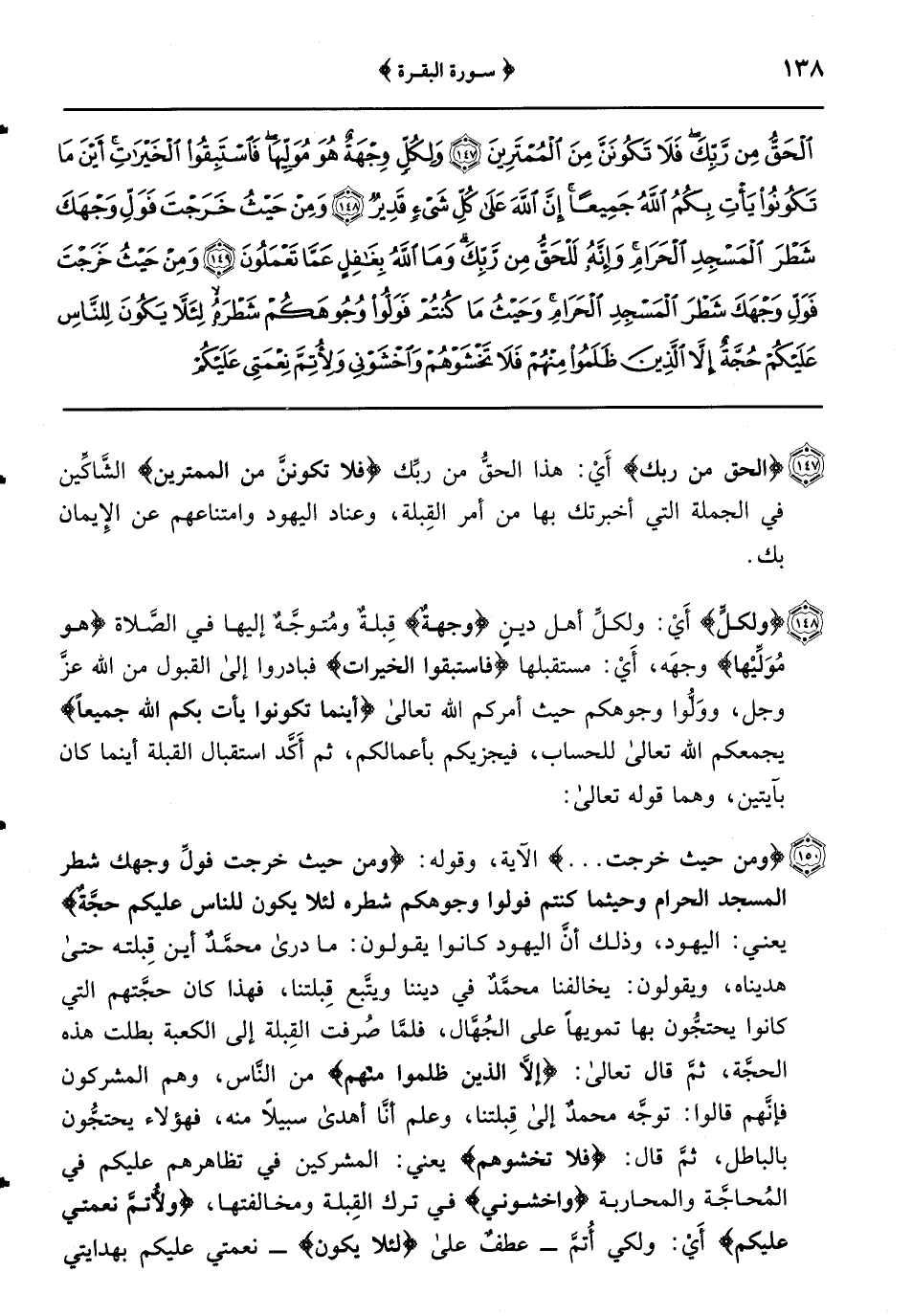 {ومن حيث خرجت} الآية وقوله: {وَمِنْ حَيْثُ خَرَجْتَ فَوَلِّ وَجْهَكَ شَطْرَ الْمَسْجِدِ الْحَرَامِ وَحَيْثُ مَا كُنْتُمْ فَوَلُّوا وُجُوهَكُمْ شَطْرَهُ لئلا يكون للناس عليكم حجَّةٌ} يعني: اليهود وذلك أنَّ اليهود كانوا يقولون: ما درى محمَّدٌ أين قِبلته حتى هديناه ويقولون: يخالفنا محمَّدٌ فِي ديننا ويتَّبِع قِبلتنا فهذا كان حجِّتهم التي كانوا يحتجُّون بها تمويهاً على الجُهَّال فلمَّا صُرفت القِبلة إلى الكعبة بطلت هذه الحجَّة ثمَّ قال تعالى: {إلاَّ الذين ظلموا منهم} من النَّاس وهم المشركون فإنَّهم قالوا: توجَّه محمدٌ إلى قِبلتنا وعلم أنَّا أهدى سبيلاً منه فهؤلاء يحتجُّون بالباطلِ ثمَّ قال: {فلا تخشوهم} يعني: المشركين في تظاهرهم عليكم فِي المُحاجَّة والمحاربة {واخشوني} فِي ترك القِبلة ومخالفتها {ولأُتمَّ نعمتي عليكم} أَيْ: ولكي أَتمَّ - عطفٌ على {لئلا يكون} - نِعْمَتِي عَلَيْكُمْ بهدايتي إيّاكم إلى قِبلة إبراهيم فَتَتِمُّ لكم الملَّة الحنيفيَّة {ولعلكم تهتدون} ولكي تهتدوا إلى قِبلة إبراهيم