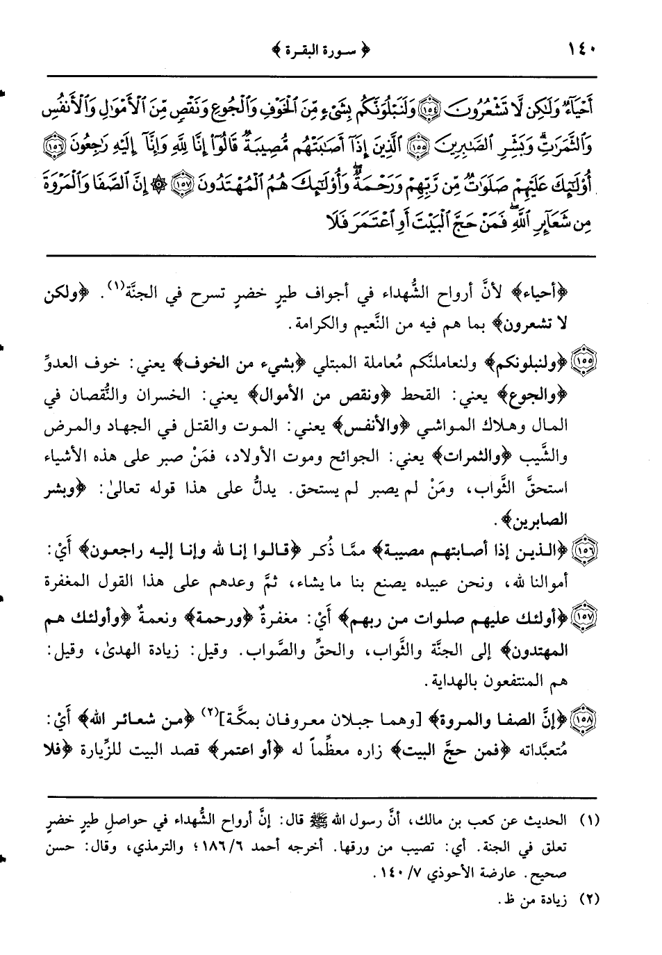{إنَّ الصفا والمروة} وهما جبلان معروفان بمكَّة {من شعائر الله} أَيْ: مُتعبَّداته {فمن حجَّ البيت} زاره معظِّماً له {أو اعتمر} قصد البيت للزِّيارة {فلا جناح عليه} فلا إثم عليه {إن يطوَّف بهما} بالجبلين وذلك أنَّ أهل الجاهليَّة كانوا يطوفون بينهما وعليهما صنمان يمسحونهما فكره المسلمون الطَّواف بينهما فأنزل الله تعالى هذه الآية {ومن تطوَّع خيراً} فعل غير المفترض عليه من طوافٍ وصلاةٍ وزكاةٍ وطاعةٍ {فإنَّ الله شاكر} مجازٍ له بعمله {عليم} بنيَّته
