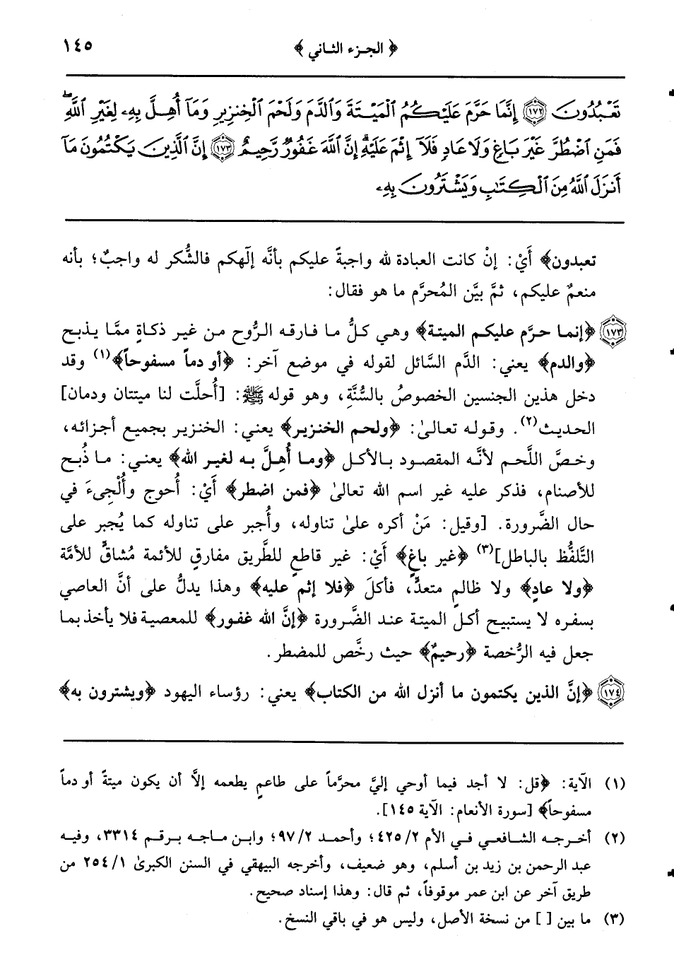 {إنما حرَّم عليكم الميتة} وهي كلُّ ما فارقه الرُّوح من غير ذكاةٍ ممَّا يذبح {والدم} يعني: الدَّم السَّائل لقوله في كوضع آخر: {أو دماً مسفوحاً} وقد دخل هذين الجنسين الخصوصُ بالسُّنَّةِ وهو [قوله صلى الله عليه وسلم: أُحلَّت لنا ميتتان ودمان] وقوله تعالى: {ولحم الخنزير} يعني: الخنزير بجميع أجزائه وخصَّ اللَّحم لأنَّه المقصود بالأكل {وما أُهِلَّ به لغير الله} يعني: ما ذُبح للأصنام فذكر عليه غير اسم الله تعالى {فمن اضطر} أَيْ: أُحوج وألجئ في حال الضَّرورة وقيل: مَنْ أكره على تناوله وأُجبر على تناوله كما يُجبر على التَّلفُّظ بالباطل {غير باغٍ} أَيْ: غير قاطعٍ للطَّريق مفارقٍ للأئمة مُشاقًّ للأمَّة {ولا عادٍ} ولا ظالم متعدٍّ فأكلَ {فلا إثم عليه} وهذا يدلُّ على أنَّ العاصي بسفره لا يستبيح أكل الميتة عند الضَّرورة {إنَّ الله غفور} للمعصية فلا يأخذ بما جعل فِيهِ الرُّخصة {رحيمٌ} حيث رخَّص للمضطر