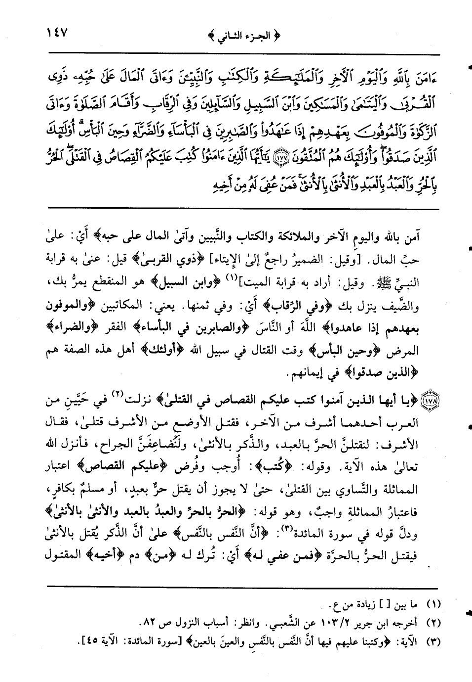 {يا أيها الَّذِينَ آمَنُوا كُتِبَ عَلَيْكُمُ الْقِصَاصُ فِي الْقَتْلَى} نزلت في حَيَّينِ من العرب أحدهما أشرف من الآخر فقتل الأوضع من الأشرف قتلى فقال الأشرف: لنقتلنَّ الحرَّ بالعبد والذَّكر بالأنثى ولَنُضاعِفَنَّ الجراح فأنزل الله تعالى هذه الآية وقوله: {كُتب} : أُوجب وفُرض {عليكم القصاص} اعتبار المماثلة والتَّساوي بين القتلى حتى لا يجوز أن يقتل حرٌّ بعبدٍ أو مسلمٌ بكافرٍ فاعتبارُ المماثلةِ واجبٌ وهو قوله: {الحرُّ بالحرِّ والعبدُ بالعبدِ والأنثى بالأنثى} ودلَّ قوله في سورة المائدة: {أنَّ النَّفس بالنَّفس} على أنَّ الذَّكر يُقتل بالأنثى فيقتل الحرُّ بالحرَّة {فمن عفي له} أَيْ: تُرك له {من} دم {أخيه} المقتول {شيءٌ} وهو أن يعفو بعض الأولياء فيسقط القود {فاتباع بالمعروف} أَيْ: فعلى العافي الذي هو ولي الدَّم أن يتبع القاتل بالمعروف وهو أن يطالبه بالمال من غير تشدُّد وأذىً وعلى المطلوب منه المال {أداءٌ} تأدية المال إلى العافي {بإحسانٍ} وهو ترك المطل والتَّسويف {ذلك تخفيفٌ من ربكم ورحمة} هو أنَّ الله تعالى خَيَّرَ هذه الأمَّة بين القصاص والدية والعفو ولم يكن ذلك إلاَّ لهذه الأُمَّة {فمن اعتدى} أَيْ: ظلم بقتل القاتل بعد أخذ الدية {فَلَهُ عَذَابٌ أَلِيمٌ}