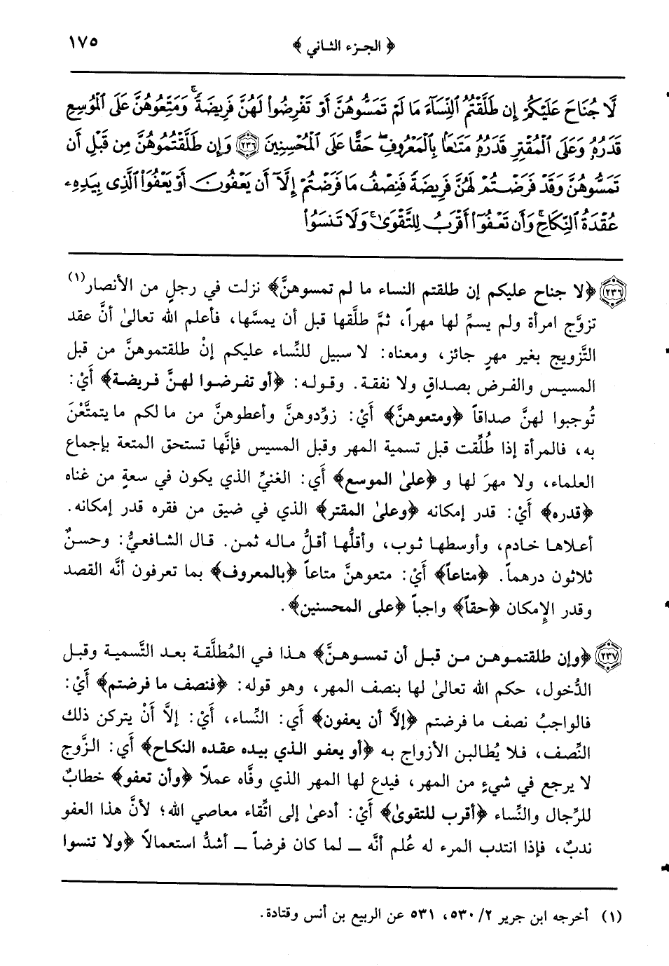 {لا جُنَاحَ عَلَيْكُمْ إِنْ طَلَّقْتُمُ النِّسَاءَ مَا لم تمسوهنَّ} نزلت في رجلٍ من الأنصار تزوَّج امرأة ولم يسمِّ لها مهراً ثمَّ طلَّقها قبل أن يمسَّها فأعلم الله تعالى أنَّ عقد التَّزويج بغير مهرٍ جائز ومعناه: لا سبيل للنِّساء عليكم إنْ طلقتموهنَّ من قبل المسيس والفرض بصداقٍ ولا نفقة وقوله: {أو تفرضوا لهنَّ فريضة} أَيْ: تُوجبوا لهنَّ صداقاً {ومتعوهنَّ} أَيْ: زوِّدوهنَّ وأعطوهنَّ من ما لكم ما يتمتَّعْنَ به فالمرأة إذا طُلِّقت قبل تسمية المهر وقبل المسيس فإنَّها تستحق المتعة بإجماع العلماء ولا مهرَ لها و {على الموسع} أَي: الغنيِّ الذي يكون في سعةٍ من غناه {قدره} أَيْ: قدر إمكانه {وعلى المقتر} الذي في ضيق من فقره قدر إمكانه أعلاها خادم وأوسطها ثوب وأقلُّها أقلُّ ماله ثمن قال الشافعيُّ: وحسنٌ ثلاثون درهماً {متاعاً} أَيْ: متعوهنَّ متاعاً {بالمعروف} بما تعرفون أنَّه القصد وقدر الإِمكان {حقاً} واجباً {على المحسنين}