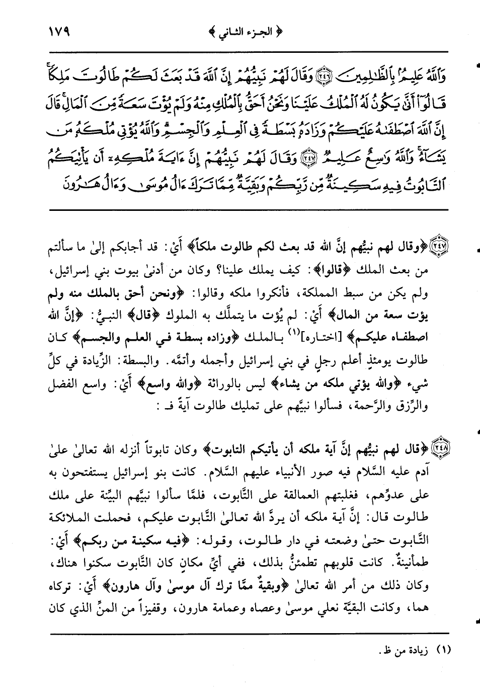 {وَقَالَ لَهُمْ نَبِيُّهُمْ إِنَّ اللَّهَ قَدْ بَعَثَ لكم طالوت ملكاً} أَيْ: قد أجابكم إلى ما سألتم من بعث الملك {قالوا} : كيف يملك علينا؟ وكان من أدنى بيوت بني إسرائيل ولم يكن من سبط المملكة فأنكروا ملكه وقالوا: {وَنَحْنُ أَحَقُّ بِالْمُلْكِ مِنْهُ وَلَمْ يُؤْتَ سَعَةً من المال} أَيْ: لم يُؤت ما يتملَّك به الملوك {قال} النبيُّ: {إنَّ الله اصطفاه عليكم} (اختاره) بالملك {وزاده بسطة في العلم والجسم} كان طالوت يومئذٍ أعلم رجلٍ في بني إسرائيل وأجمله وأتمَّه والبسطة: الزِّيادة في كلِّ شيء {والله يؤتي ملكه من يشاء} ليس بالوراثة {والله واسع} أَيْ: واسع الفضل والرِّزق والرَّحمة فسألوا نبيَّهم على تمليك طالوت آية فـ