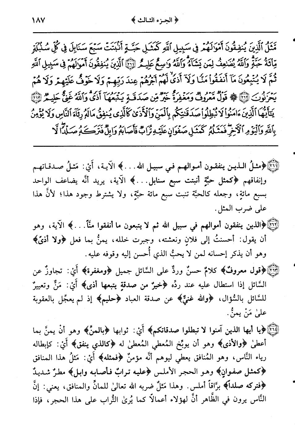 {يا أيها الذين آمنوا لا تبطلوا صدقاتكم} أَيْ: ثوابها {بالمنِّ} وهو أنْ يمنَّ بما أعطى {والأذى} وهو أن يوبِّخ المُعطي المُعطى له {كالذي ينفق} أَيْ: كإبطاله رياء النَّاس وهو المُنافق يعطي ليوهم أنَّه مؤمنٌ {فمثله} أَيْ: مَثلُ هذا المنافق {كَمَثَلِ صَفْوَانٍ} وهو الحجر الأملس {عَلَيْهِ تُرَابٌ فأصابه وابل} مطرٌ شديدٌ {فتركه صلداً} برَّاقاً أملس وهذا مَثلٌ ضربه الله تعالى للمانِّ والمنافق يعني: إنَّ النَّاس يرون في الظَّاهر أنَّ لهؤلاء أعمالاً كما يُرى التُّراب على هذا الحجر فإذا كان يوم القيامة اضمحلَّ كلُّه وبطل كما أذهب الوابل ما كان على الصفوان فلا يقدر أحدٌ من الخلق على ذلك التُّراب كذلك هؤلاء إذا قدموا على ربِّهم لم يجدوا شيئاً وهو قوله جلَّ وعزَّ {: لا يَقْدِرُونَ عَلَى شَيْءٍ} أَيْ: على ثواب شَيْءٍ {مِمَّا كَسَبُوا وَاللَّهُ لا يَهْدِي الْقَوْمَ الكافرين} لا يجعل جزاءهم على كفرهم أن يهديهم (ثمَّ ضرب مثلاً لمن ينفق يريد ما عند الله ولا يمنُّ ولا يؤذي فقال) :