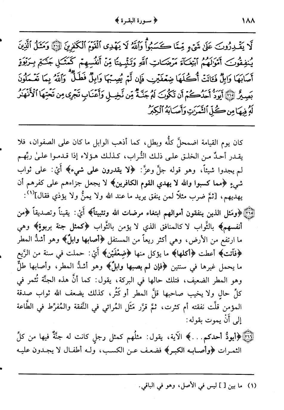{ومَثل الذين ينفقون أموالهم ابتغاء مرضاة الله وتثبيتاً} أَيْ: يقيناً وتصديقاً {من أنفسهم} بالثَّواب لا كالمنافق الذي لا يؤمن بالثَّواب {كمثل جنة بربوةٍ} وهي ما ارتفع من الأرض وهي أكثر ريعاً من المستفل {أصابها وابلٌ} وهو أشدُّ المطر {فآتت} أعطت {أكلها} ما يؤكل منها {ضِعْفَيْن} أَيْ: حملت في سنة من الرَّيع ما يحمل غيرها في سنتين {فإن لم يصبها وابلٌ} وهو أشدُّ المطر وأصابها طلٌّ وهو المطر الضعيف فتلك حالها في البركة يقول: كما أنَّ هذه الجنَّة تُثمر في كلِّ حالٍ ولا يخيب صاحبها قلَّ المطر أو كَثُر كذلك يضعف الله ثواب صدقة المؤمن قلَّت نفقته أم كثرت ثمَّ قرَّر مَثَل المُرائي في النَّفقة والمُفرِّط في الطَّاعة إلى أَنْ يموت بقوله: