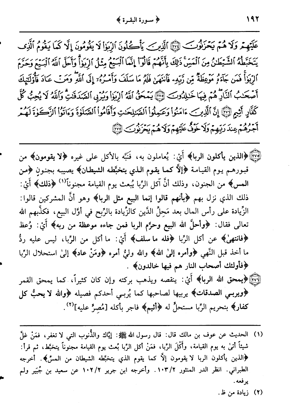{الذين يأكلون الربا} أيْ: يُعاملون به فَنَبَّه بالأكل على غيره {لا يقومون} من قبورهم يوم القيامة {إلاَّ كما يقوم الذي يتخبَّطه الشيطان} يصيبه بجنونٍ {من المس} من الجنون وذلك أنَّ آكل الرِّبا يُبعث يوم القيامة مجنوناً {ذلك} أَيْ: ذلك الذي نزل بهم {بأنهم قالوا إنما البيع مثل الربا} وهو أنَّ المشركين قالوا: الزِّيادة على رأس المال بعد مَحِلِّ الدَّين كالزِّيادة بالرِّبح في أوَّل البيع فكذَّبهم الله تعالى فقال: {وَأَحَلَّ اللَّهُ الْبَيْعَ وَحَرَّمَ الرِّبَا فَمَنْ جاءه موعظة من ربه} أَيْ: وُعظ {فانتهى} عن أكل الرِّبا {فَلَهُ مَا سَلَفَ} أَّيْ: ما أكل من الرِّبا ليس عليه ردُّ ما أخذ قبل النَّهي {وأمره إلى الله} والله وليُّ أمره {ومَنْ عاد} إلى استحلال الرِّبا {فَأُولَئِكَ أَصْحَابُ النَّارِ هُمْ فِيهَا خَالِدُونَ}