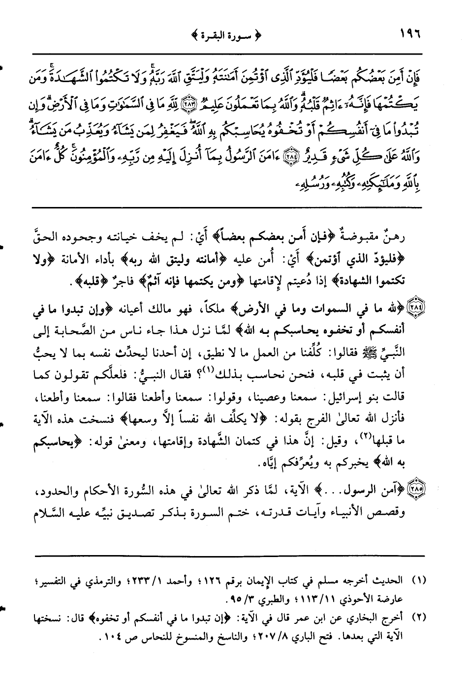 {لله ما في السماوات وما في الأرض} ملكا فهو مالك أعيانه {وَإِنْ تُبْدُوا مَا فِي أَنْفُسِكُمْ أَوْ تُخْفُوهُ يحاسبكم به الله} لمَّا نزل هذا جاء ناس من الصَّحابة إلى النبي صلى الله عليه وسلم فقالوا: كُلِّفنا من العمل ما لا نطيق إن أحدنا ليحدِّث نفسه بما لا يحبُّ أن يثبت في قلبه فنحن نحاسب بذلك؟ فقال النبيُّ: فلعلَّكم تقولون كما قالت بنو إسرائيل: سمعنا وعصينا وقولوا: سمعنا وأطعنا فقالوا: سمعنا وأطعنا فأنزل الله تعالى الفرج بقوله: {لا يُكَلِّفُ اللَّهُ نَفْسًا إِلا وُسْعَهَا} فنسخت هذه الآية ما قبلها وقيل: إنَّ هذا في كتمان الشَّهادة وإقامتها ومعنى قوله: {يحاسبكم به الله} يخبركم به ويُعرِّفكم إيَّاه
