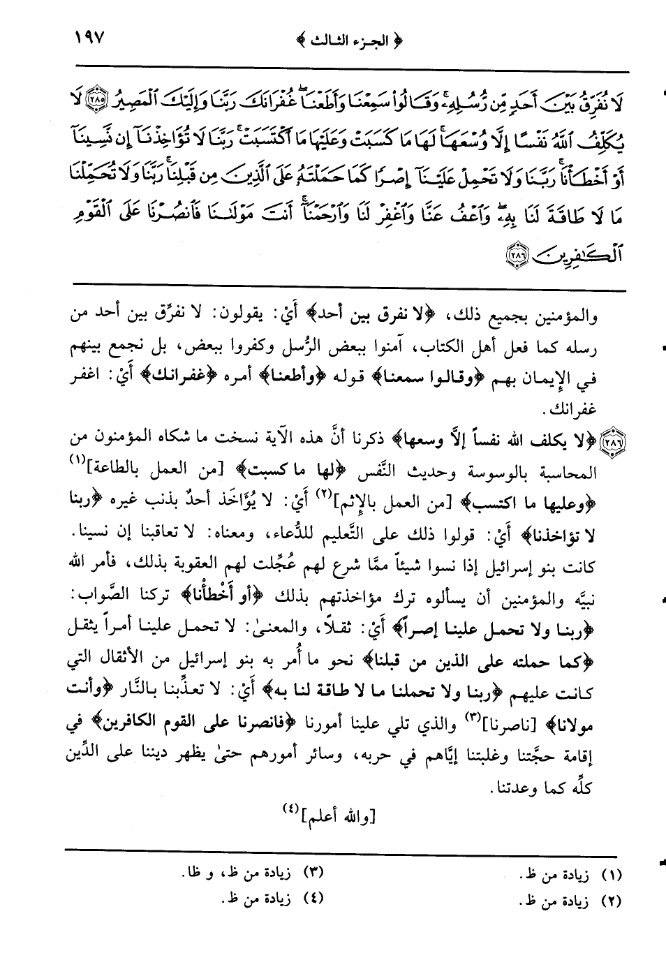 {لا يكلف الله نفسا إلاَّ وسعها} ذكرنا أنَّ هذه الآية نسخت ما شكاه المؤمنين من المحاسبة بالوسوسة وحديث النَّفس {لَهَا مَا كَسَبَتْ} (من العمل بالطاعة) {وَعَلَيْهَا ما اكتسبت} (من العمل بالإثم) أَيْ: لا يُؤَاخَذ أحدٌ بذنب غيره {ربنا لا تؤاخذنا} أَيْ: قولوا ذلك على التَّعليم للدُّعاء ومعناه: لا تعاقبنا إن نسينا كانت بنو إسرائيل إذا نسوا شيئاً ممَّا شرع لهم عُجِّلت لهم العقوبة بذلك فأمر الله نبيَّه والمؤمنين أن يسألوه ترك مؤاخذتهم بذلك {أو أَخْطأْنا} تركنا الصَّواب: {ربنا ولا تحمل علينا إصراً} أَيْ: ثقلاً والمعنى: لا تحمل علينا أمراً يثقل {كما حملته على الذين من قبلنا} نحو ما أُمر به بنو إسرائيل من الأثقال التي كانت عليهم {رَبَّنَا وَلا تُحَمِّلْنَا مَا لا طَاقَةَ لَنَا به} أَيْ: لا تعذِّبنا بالنَّار {أنت مولانا} ناصرنا والذي تلي علينا أمورنا {فَانْصُرْنَا عَلَى الْقَوْمِ الْكَافِرِينَ} في إقامة حجَّتنا وغلبتنا إيَّاهم في حربه وسائر أمورهم حتى يظهر ديننا على الدِّين كلِّه كما وعدتنا
